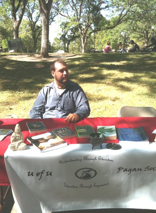 President Daniel Cureton got the first booth for UUPS at the U of U Welcome Week August 26, 2010. Set up on the Student Union west lawn and thankfully in the shade, the sun rose in the August sky and students passed by. Plenty of Pagan literature was on the table for those interested in Paganism. The new club is up and going and is recruiting well.