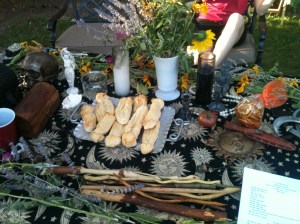 After the druid rite of Sul, everyone present partook of the sacred bread, traditionally baked and offered at Lughansadh as part of the first harvest… except this bread turned out extra special in the oven. Lugh himself was seen in the kitchen shaping these into nothing else but the proper representation of the Celtic Sun God… the phallic! With the semi beltane energy and the rise phallic of the Sun God… all were very grateful to give thanks and tell everyone what they are thankful for at this harvest time. The phallices were thrown into the Lugh fire and president Muad’Dib read the story of the Tuatha de Danann to close up the rite!