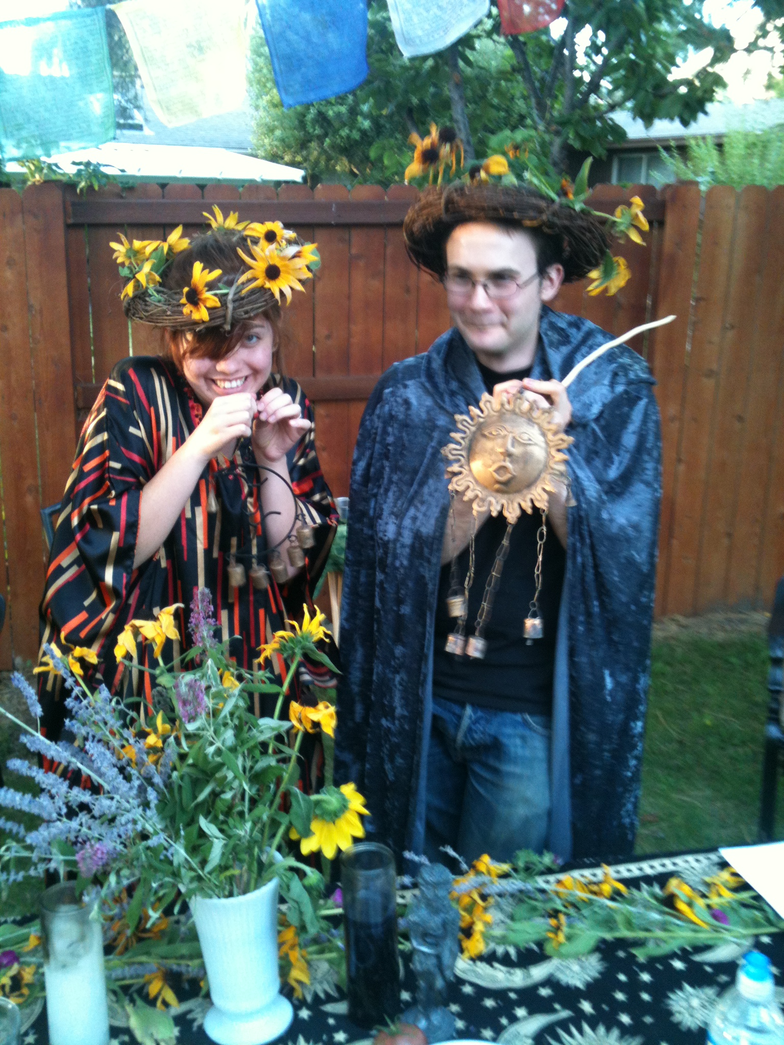 The ritual started off with the usual clearing and cleansing of the sacred space at the Salt Lake City Temple of the Sun and Moon. After the barriers were put up, President Muad’Dib opened the circle in the revivalist druidic style before calling in the four quarters. With everything and everyone present, including the archangels, everyone present was blessed by the God Lugh and his consort Rosmerta. They shook bells and chimes to help focus the energy. President Muad’Dib then called upon the Goddess Sul, the Celtic Sun Goddess, to give grace and guidance to all present. With the beating of a drum and the shaking of the chimes, Sul showed up on cue, electrified and ecstatic to be there! She opened the way for others who were experiencing journings and feelings of love in the circle! Several reported being swept away to the clouds for a time during Sul’s presence!
