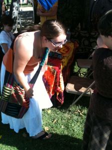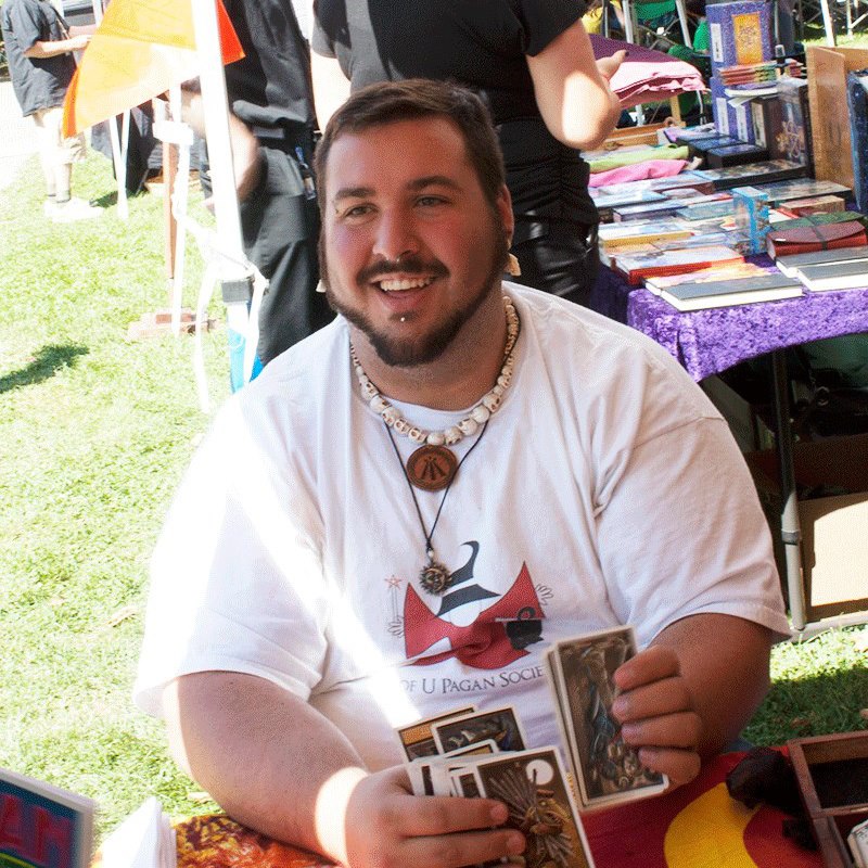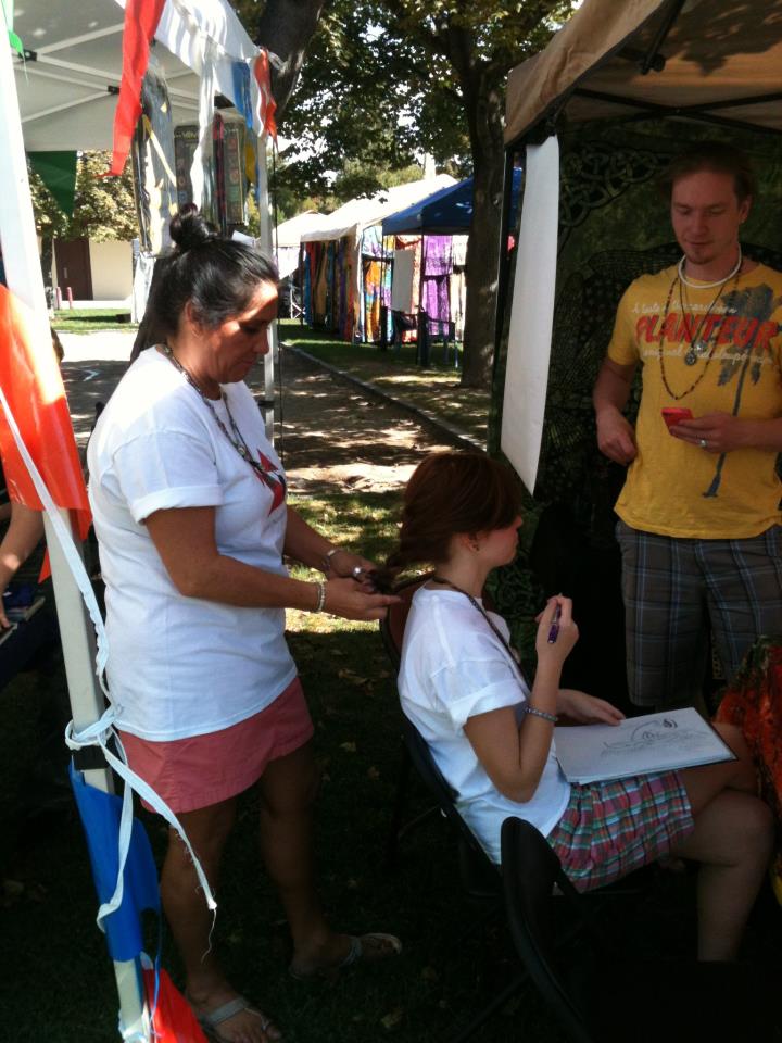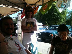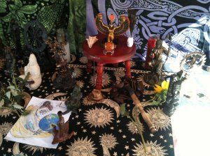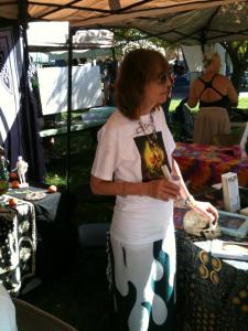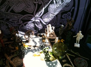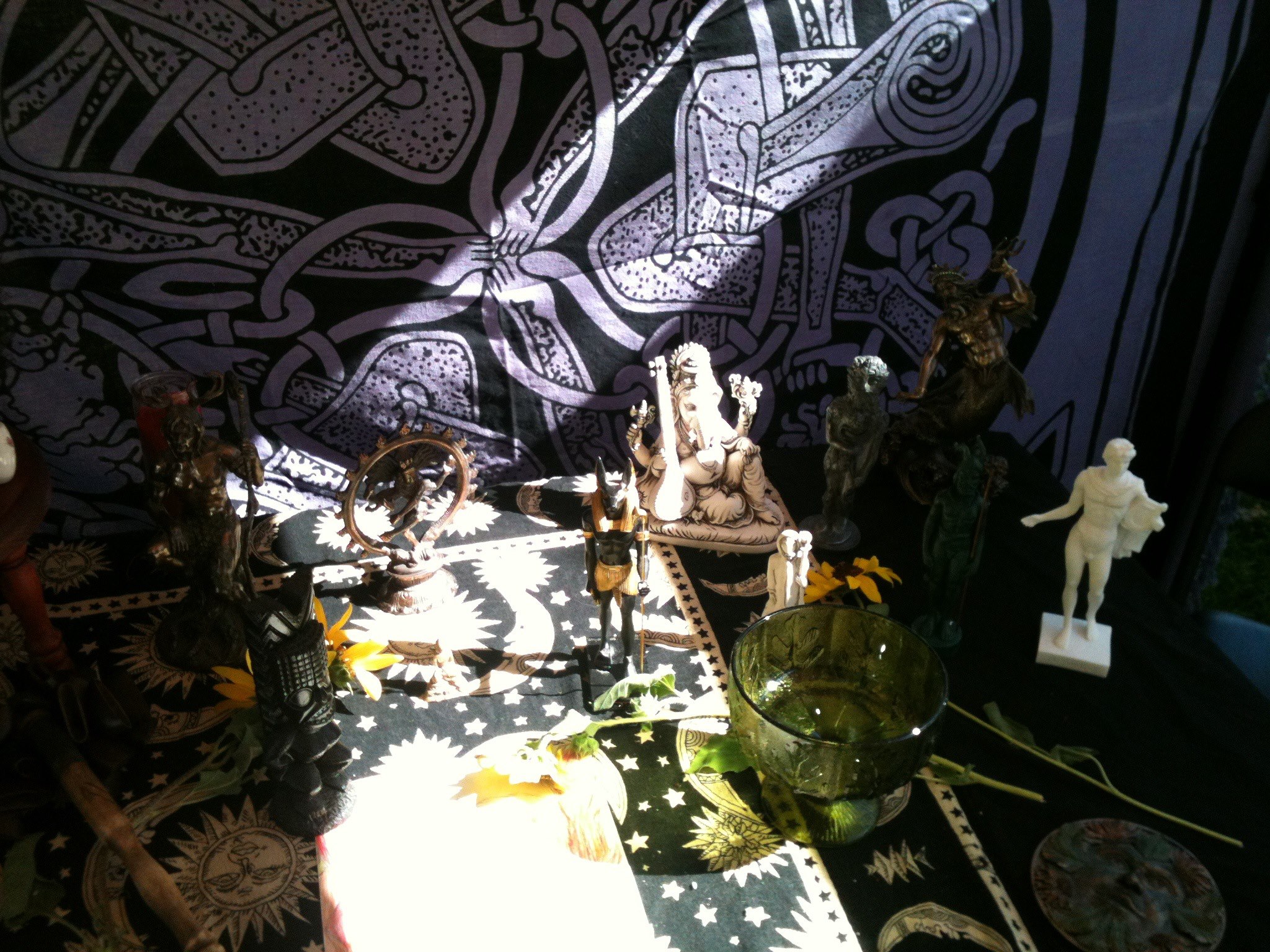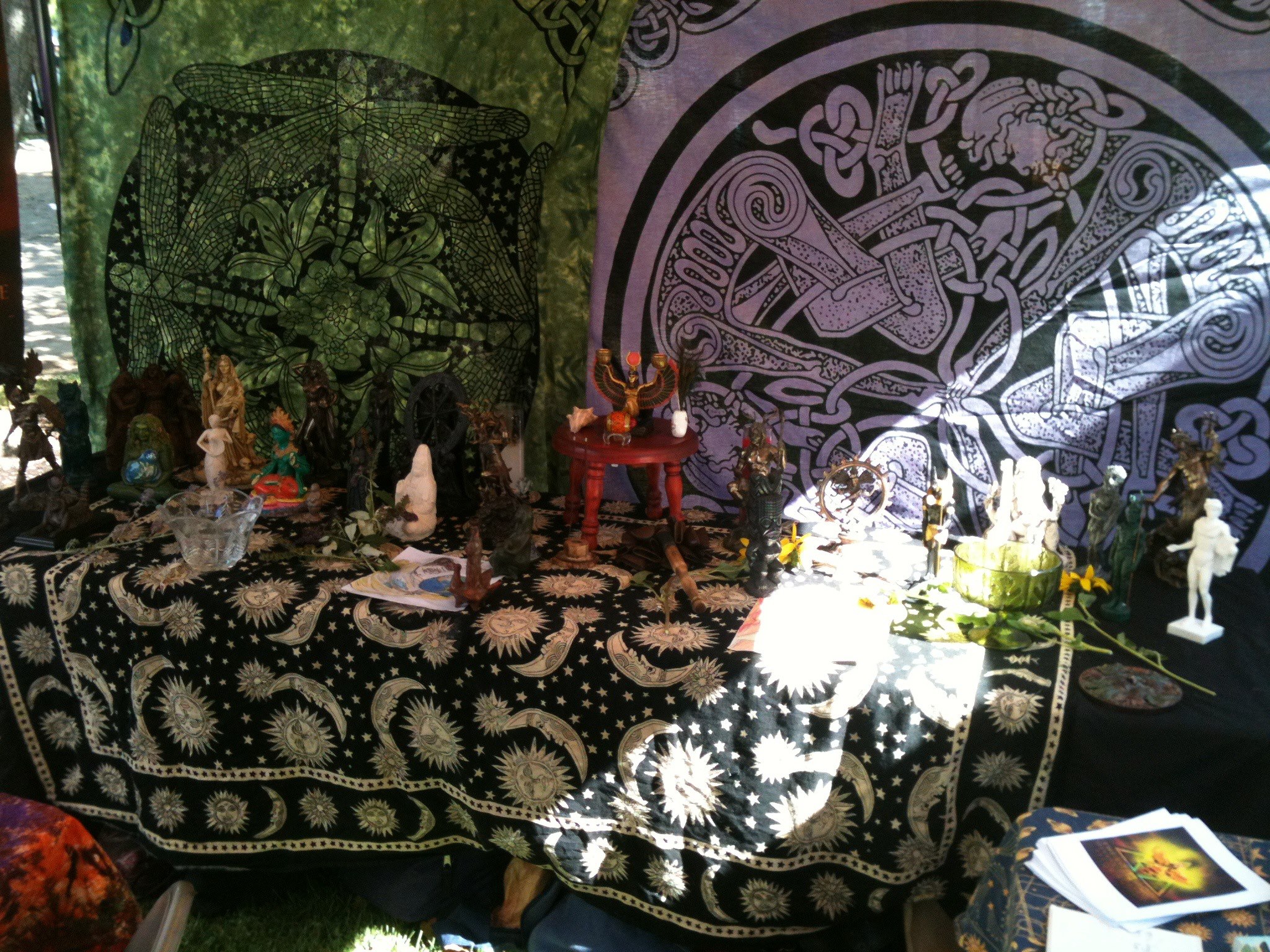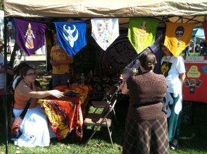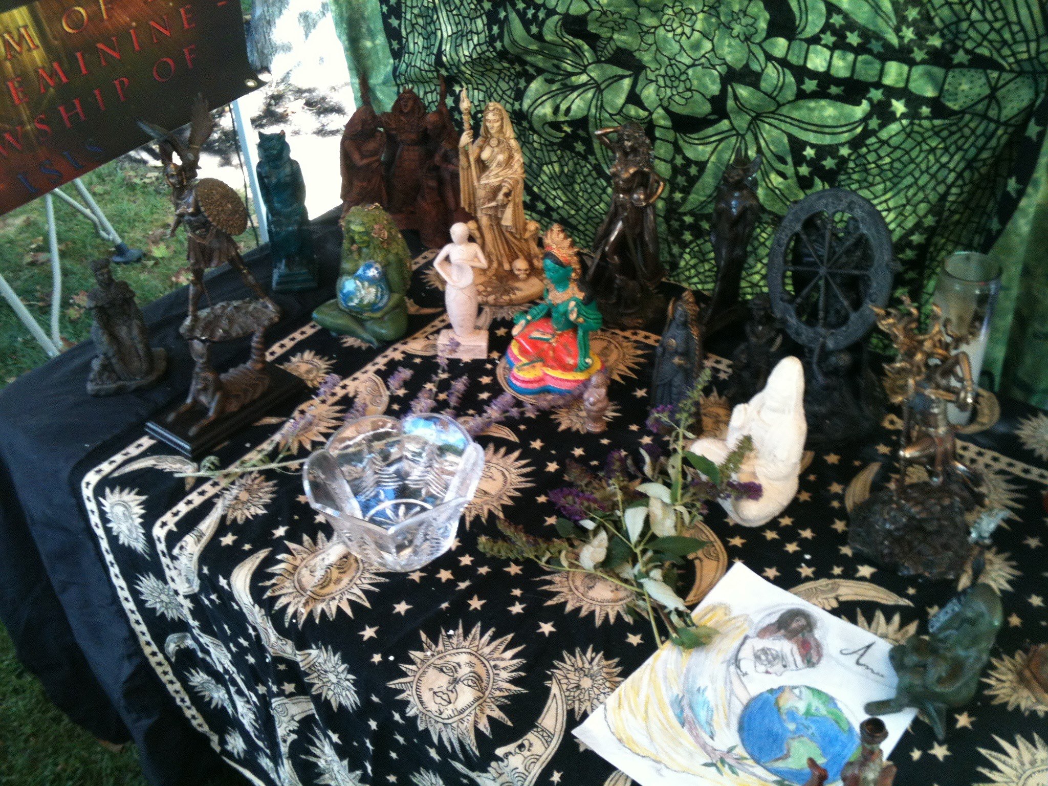 The opening ritual of the festival included a simple dancing ritual by the members of Earth Haven Coven and Crone’s Hollow. Shortly after the ritual, flocks of people came to the booth to to receive free tarot readings as well as to see the big joint altar set up by UUPS and one of the sister groups of UUPS The Iseum of the Divine Feminine-Fellowship of Isis. Thinking statues were for sale, several members had to be one watch to make sure none of the gods and goddess tried to leave with curious patrons. At noon, a thelemic ritual was performed by two members of Horus Oasis O.T.O. right next to the booth… it was quite interesting trying to read the tarot with all the “hail Horus and AGLA”s!! A few people did utilize the opportunity and gave a few hails of their own at the joint altar and cleansed some items in the holy water representing the Goddesses.