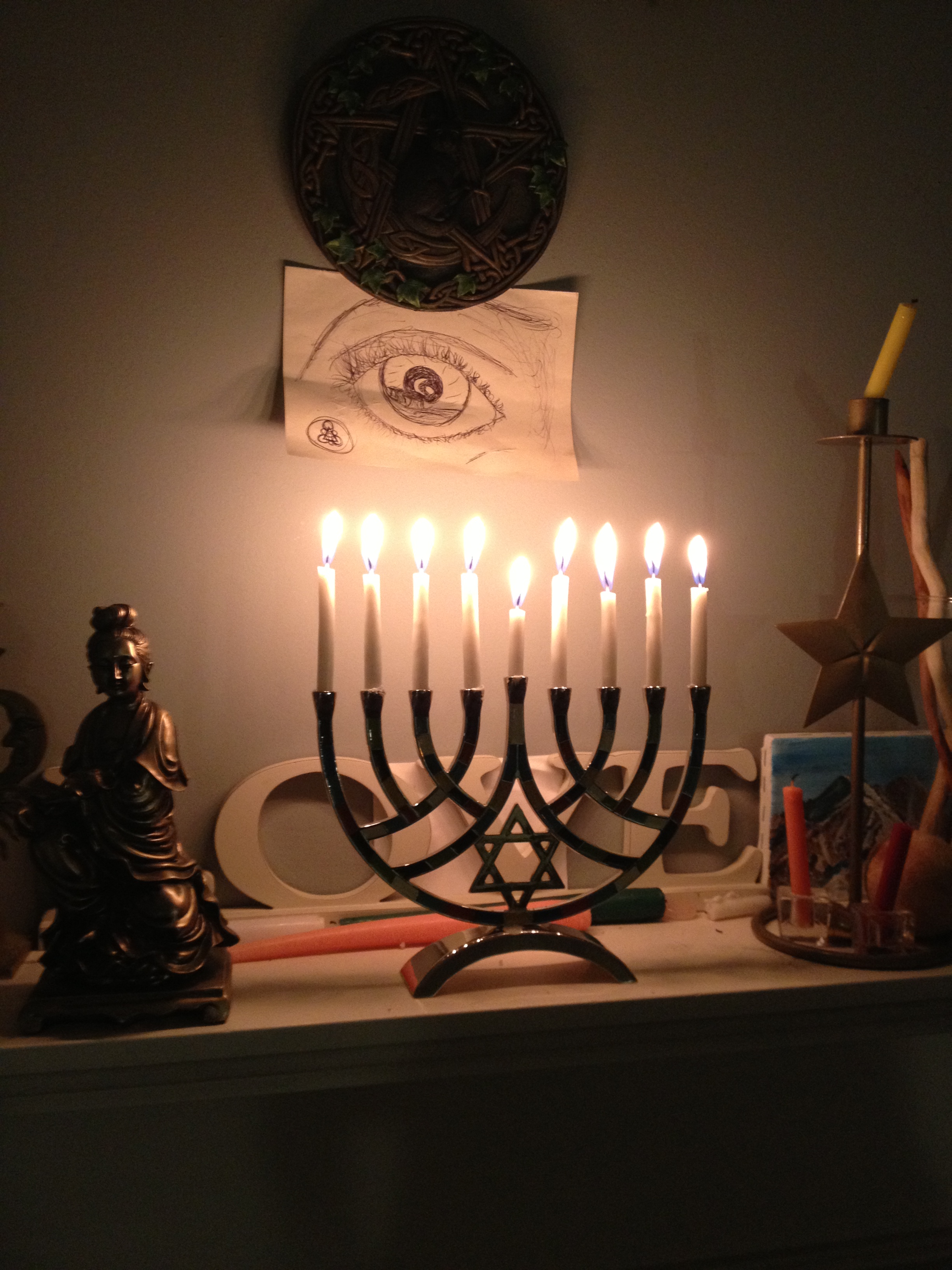 December New Moon Ritual 2012 » December new moon 2012 Hanukkiah on mantle with the all seeing eye.