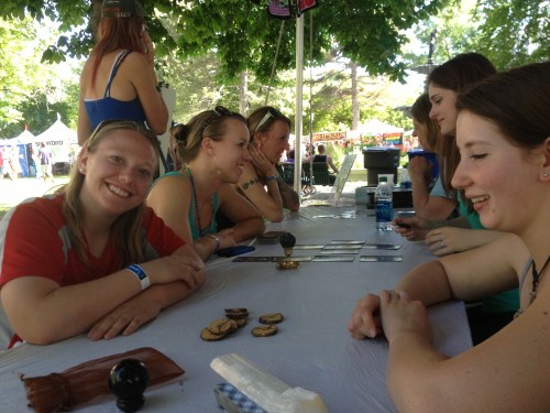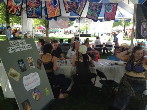 After the march, SLPS opened the tent for business with Free Tarot Readings. Special mermaid readings were available from MerQueen Lei Loni Tilley, Founder and Queen of the Mermaids of the Great Salt Lake. Witch’s Runes were also being read by Azetta, Seedling of the Blue Dragon. President Muad’Dib used his Deviant Moon Tarot, Piggy had the Rider-Waite, Lunar Oak Spirit had the Shamanic Tarot, and Woman Between the Wolves was on the Robin Wood Tarot.