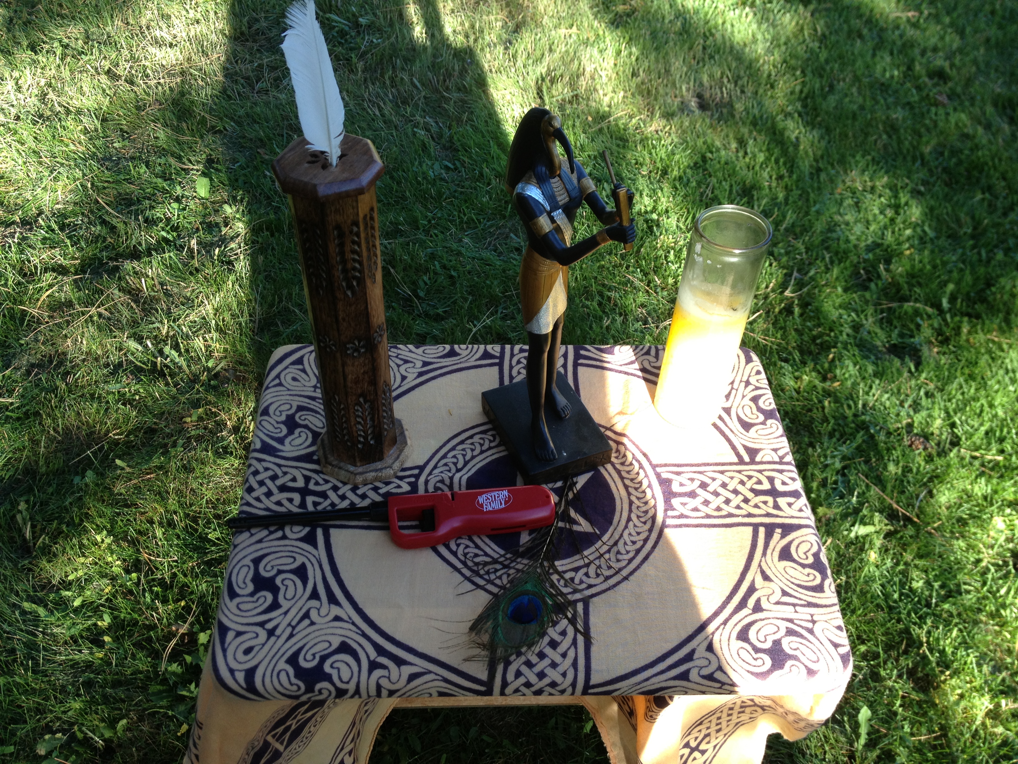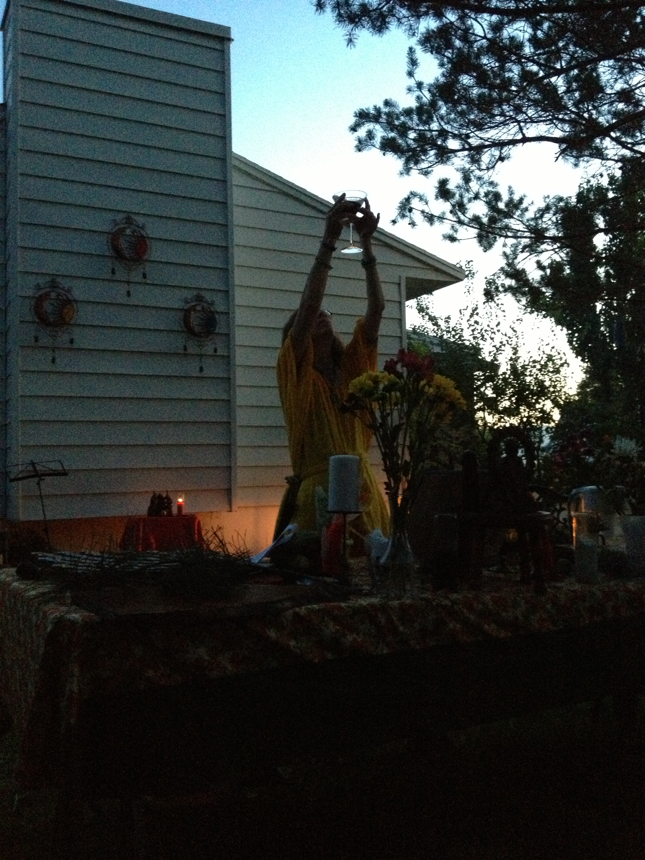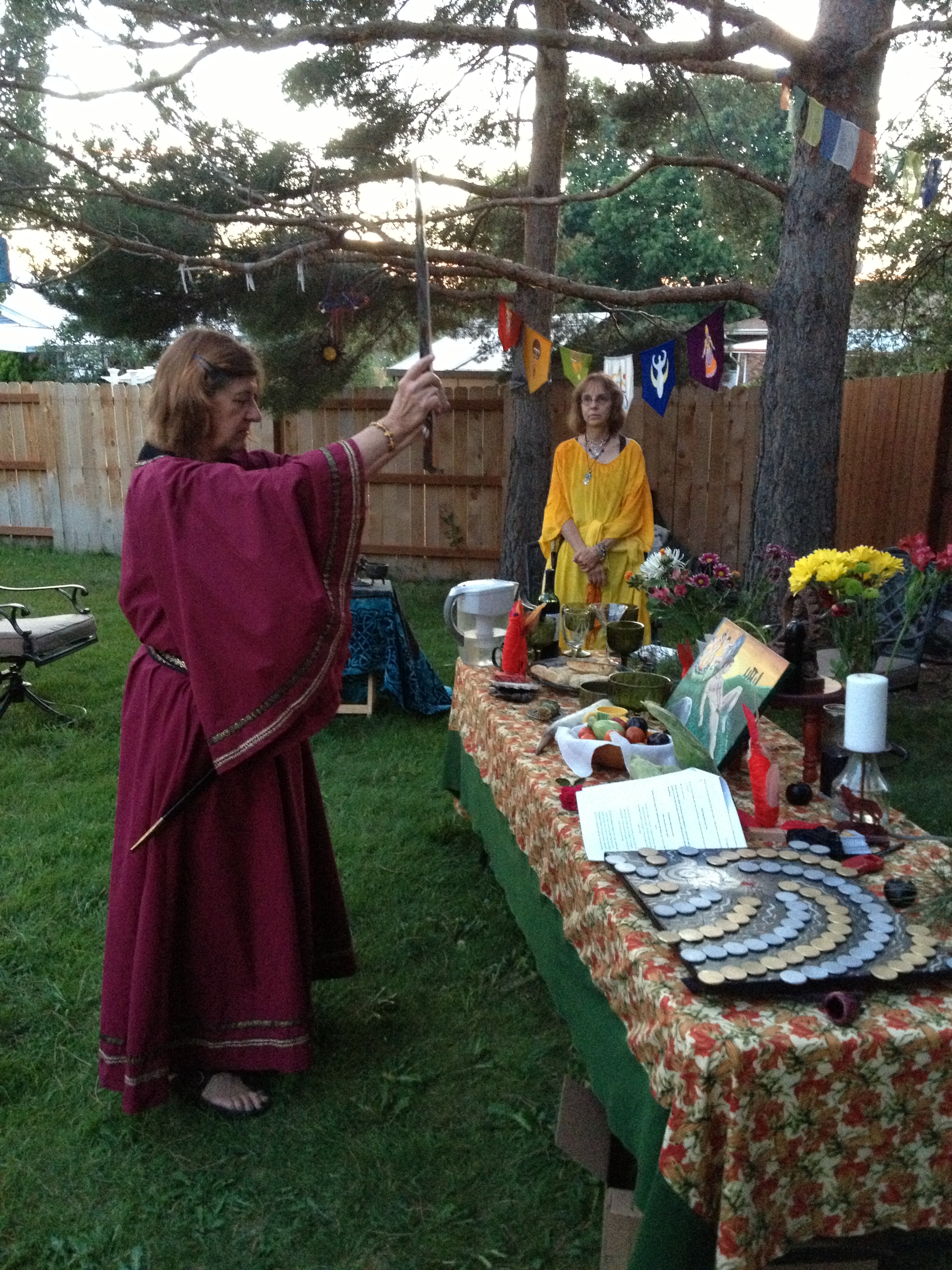 Thanks to all who came and attended Lughnasadh on Saturday, August 3, 2013 at 6pm. The sabbat kicked off with the usual preparations of cleaning the temple site, pine cone and doggie poo sweeps, and set up. A pre ritual crafting activity took place with several society members making Corn Mothers. At this time of harvest of the grains, corn or maize as it was known in South America, was the sustaining grain for the peoples there. The Corn Mother was believed to be the responsible for production and care of her peoples through providing corn. Since this is a crop Lughnasadh, it was appropriate to make and decorate them to her and to Lugh.