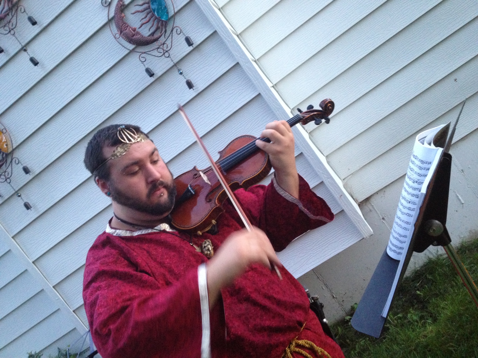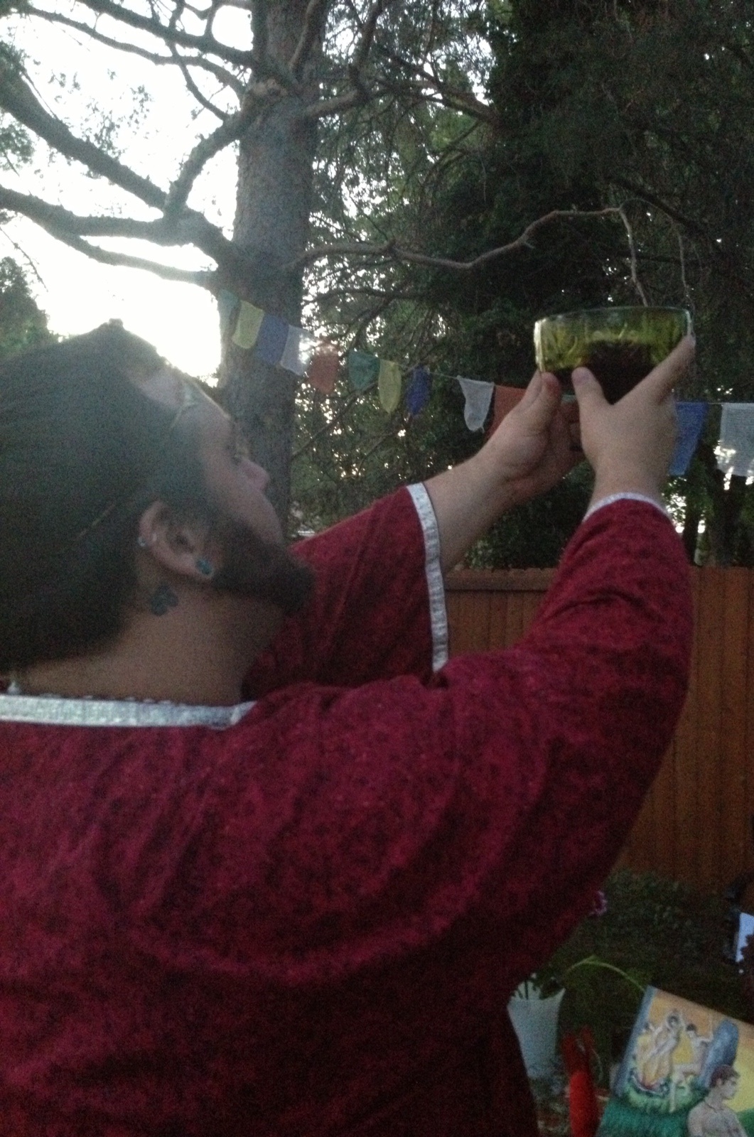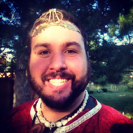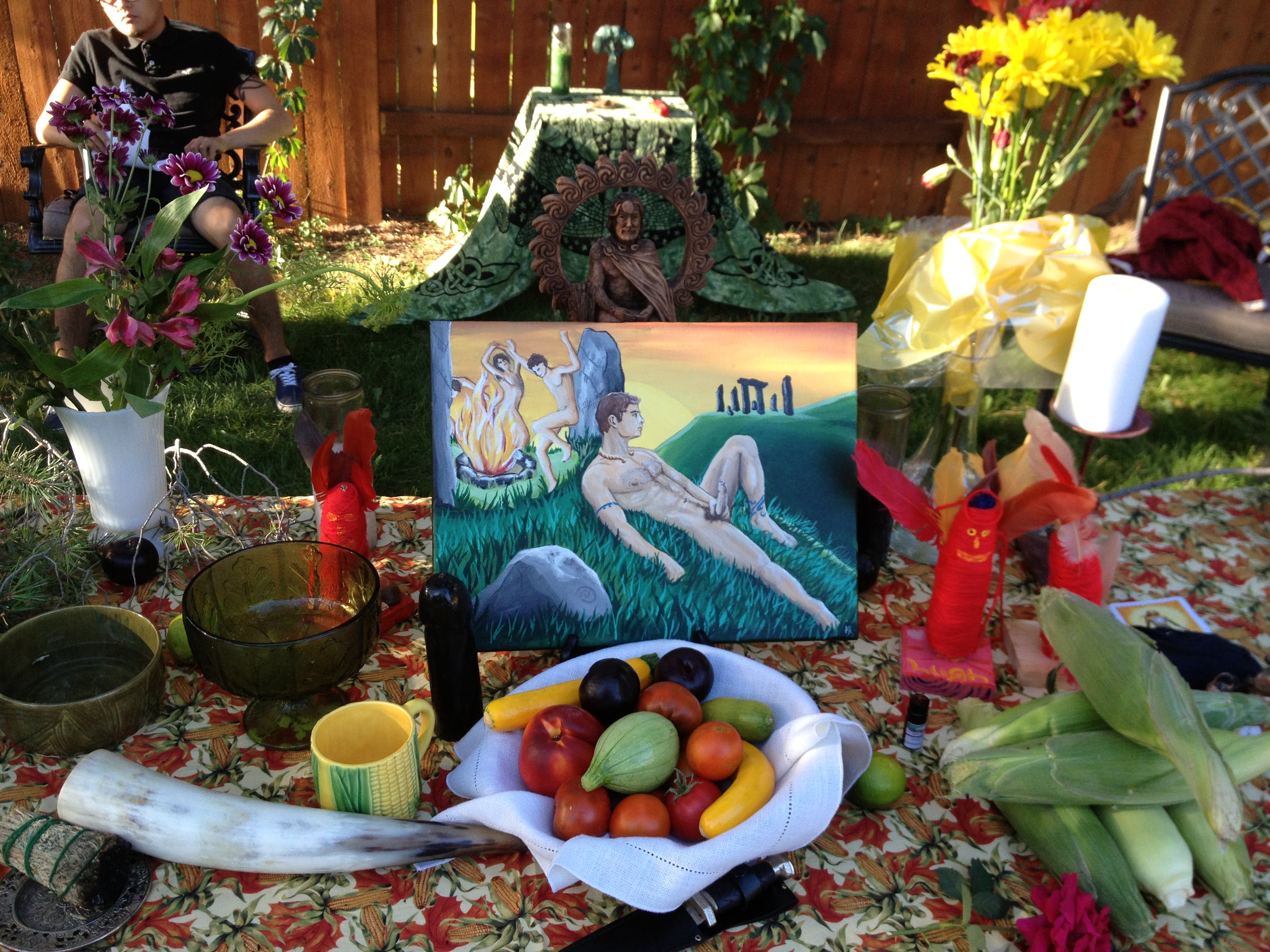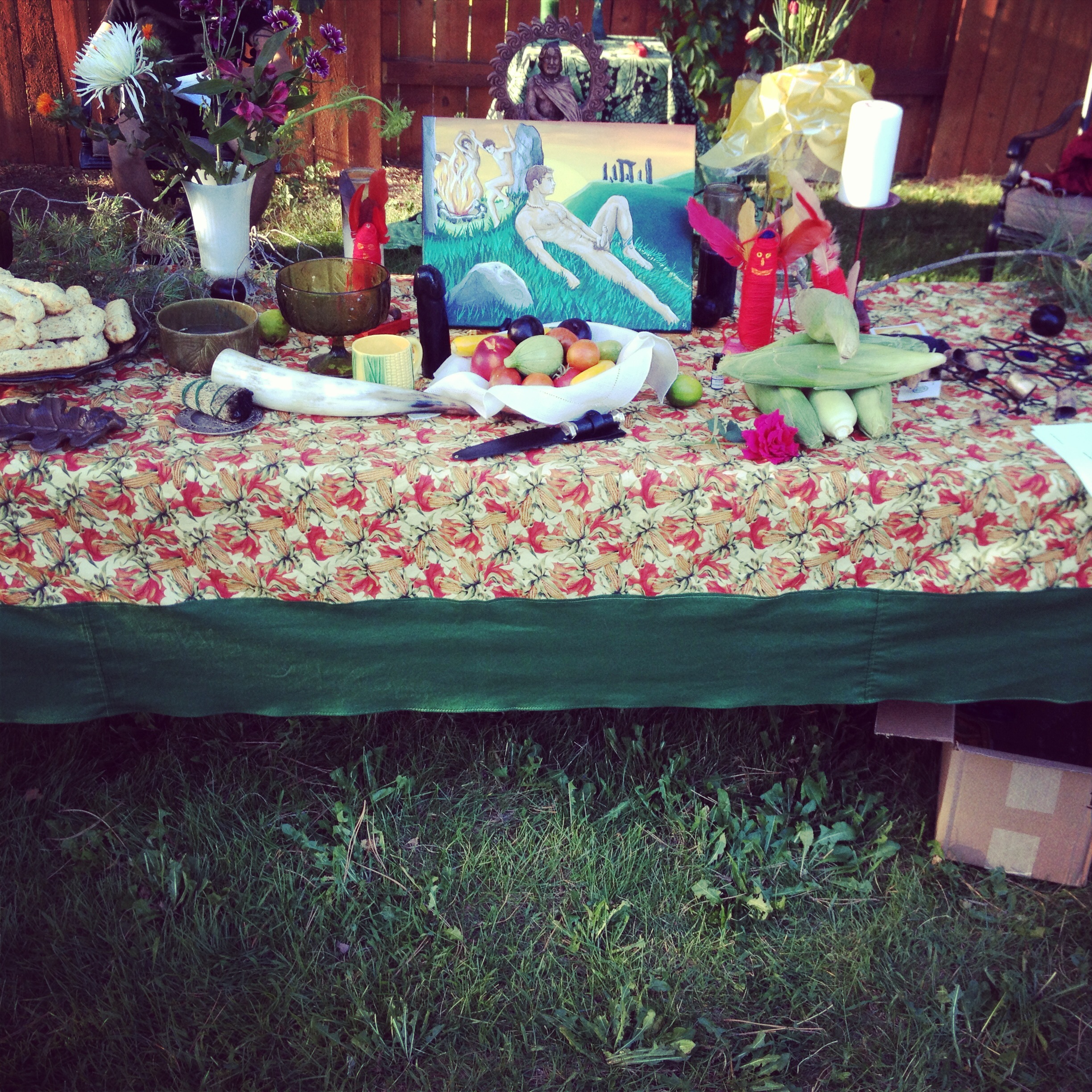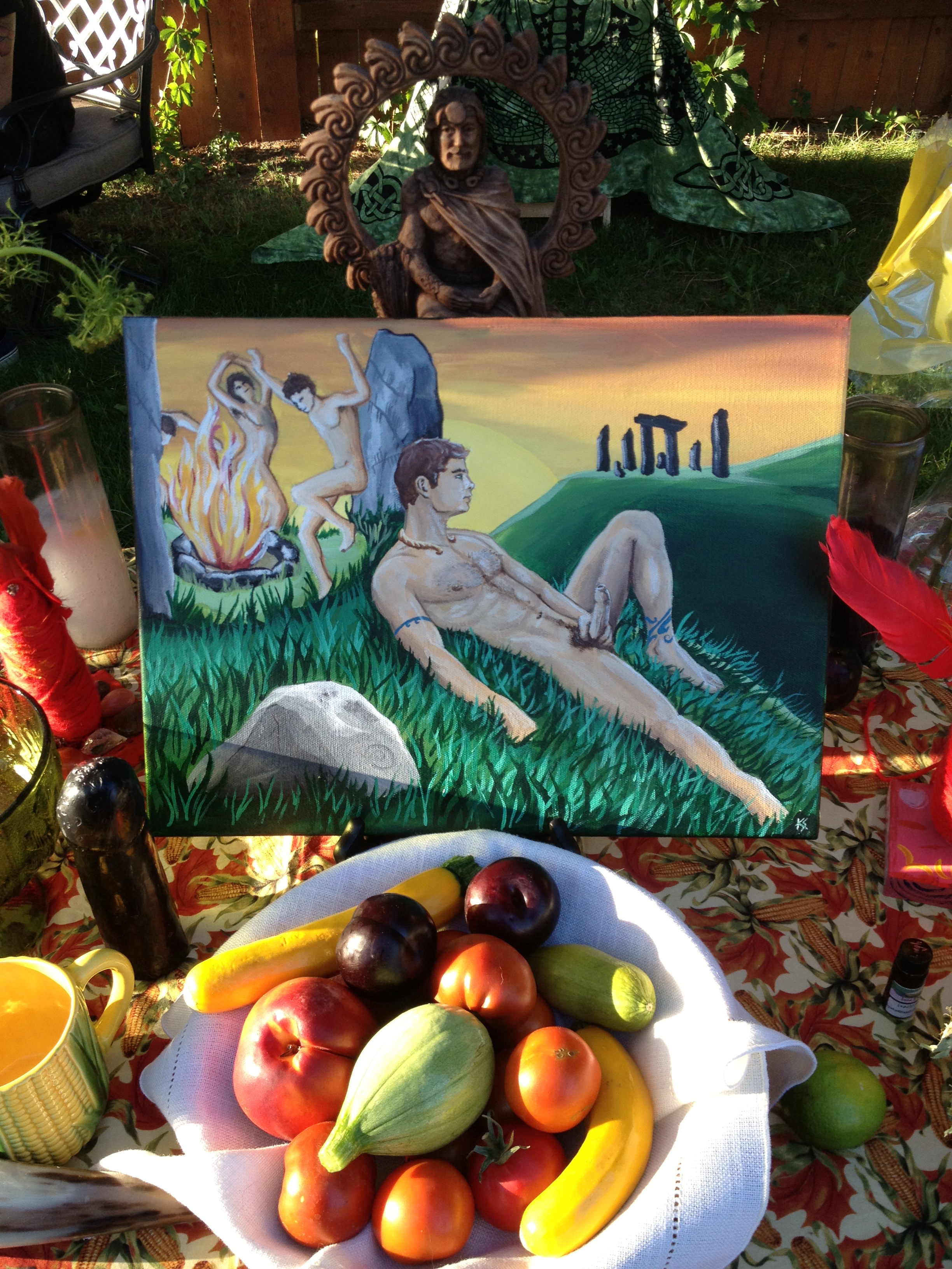 The ritual began with the usual open rites and cleansing rituals. A few special items decorated the altar including a Lughnasadh corn designed table cloth made by April Love, a corn chalice, a black phallus candle, and the crowning center item a Lugh painting of Lugh lying against a hill side with an erect uncut phallus of acrylic on canvas done by Kurt Shoopman in Kentucky. Other items included seasonal flowers, branches, penis bread, and the first fruits of the harvest. Lugh and his consort Cernunnos spoke to the guests. Afterwards people enjoyed special cheese and chive penis bread made by April Love and said what they were grateful for at this time of thanksgiving. President Daniel Cureton performed a druid rite to Sul, after which he performed Celtic reels on the violin, honoring Lugh, Cernunnos, and Sul. Other offerings, libations, and blessing were performed by the society members including a blessing of a Ganesh painting and a wood burned Ingvas. Iyata Bond blessed everyone with a Lughnasadh oil made by her for the occasion.