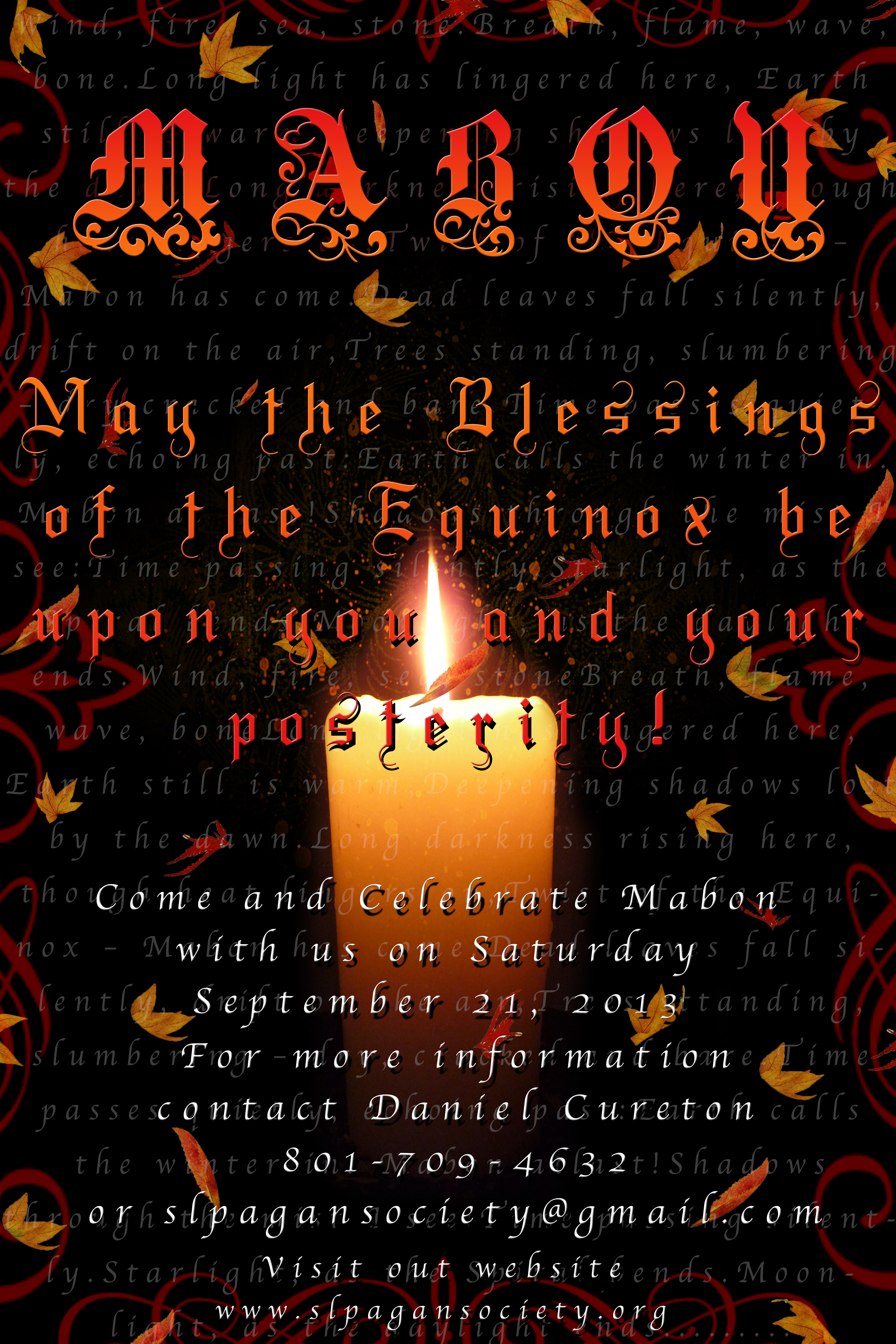 The time has come to prepare for what lies ahead…. the dark times! Mabon is the time of year when the sun lessens in strength and light and when the night begins to become the ruling phase of our lives. The God is aging and preparing for his departure at Samhain and the Goddess starts her transition into the Crone phase. The second of the three harvests, the crops that have come in around this time are berries, pears, peaches, and mushrooms. The ritual will be held on Saturday, September 21, 2013 at 6pm in the New American Tradition. SLPS president Daniel Cureton will lead the ritual. The center piece is a commissioned painting acrylic on canvas by the favored artist Kurt Shoopman of Kentucky featuring several skyclad gods dancing around the Mabon fire. Feasting afterward as usual. If you’d like to attend the next sabbat, please come to Witches’ Tea for more info.