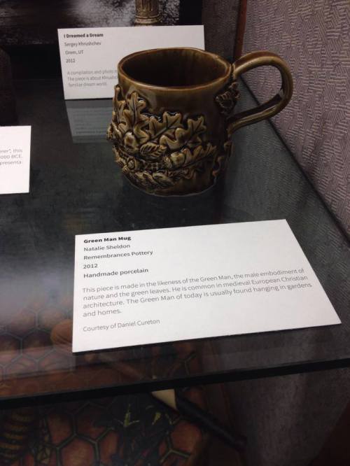 A Look at Paganism Exhibition, Green Man mug by Natalie Dufort Sheldon of Remembrances Pottery in Sarnia, Canada, University of Utah J. Willard Marriott Library Level 1, January 17- March 16, 2014, Salt Lake City, UT