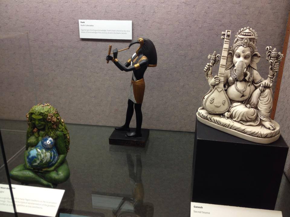 A Look at Paganism Exhibition, deity statues l to r-Gaia, Thoth, and Ganesh, University of Utah J. Willard Marriott Library Level 1, January 17- March 16, 2014, Salt Lake City, UT