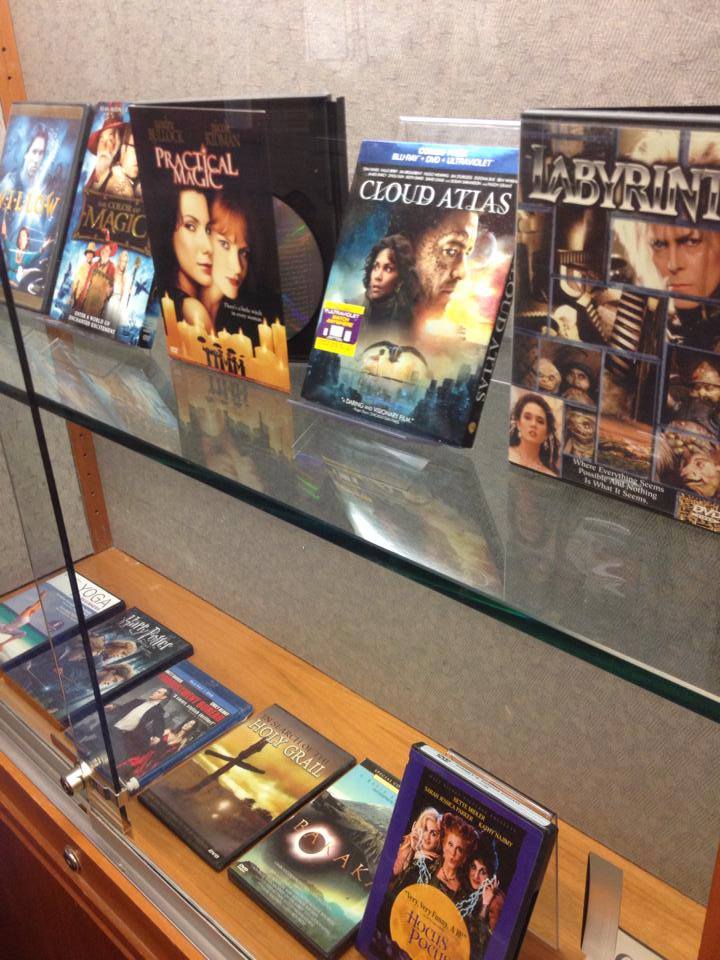 A Look at Paganism Exhibition, Wall display cases l to r- movies, deity statues, divination and jewelry, ritual items and elementals, University of Utah J. Willard Marriott Library Level 2, January 17- March 16, 2014, Salt Lake City, UT