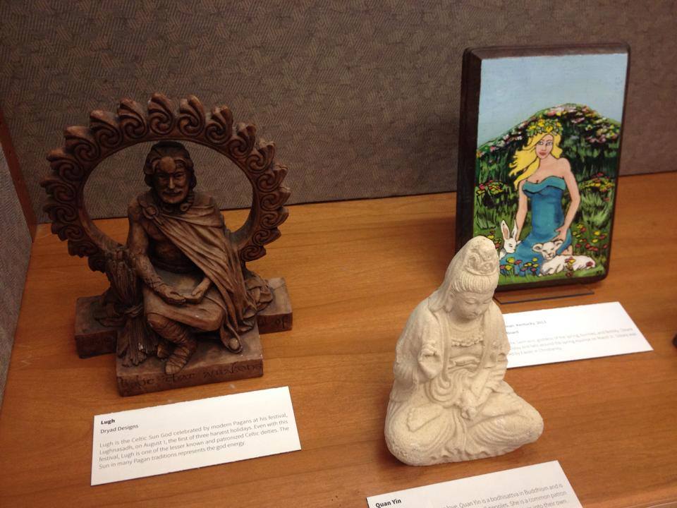 A Look at Paganism Exhibition, deity statues l to r-Lugh, Kwan Yin, and Eostre plaque by Kurt Shoopman of Kentucky, University of Utah J. Willard Marriott Library Level 1, January 17- March 16, 2014, Salt Lake City, UT
