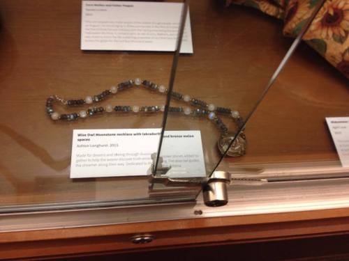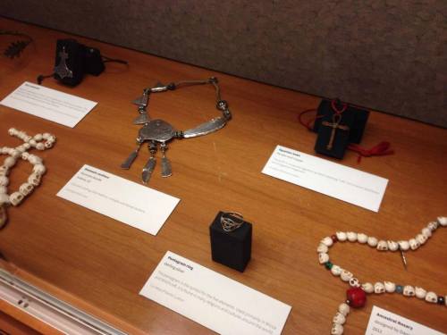 A Look at Paganism Exhibition, jewelry l to r- Oak leaf circlet, Thor’s Hammer, Awen and skull bead necklace made by Muad’Dib, First Nation necklace, Pentagram Wicca ring, Copper and peridot Ankh, and right is an ancestral rosary made by Muad’Dib, University of Utah J. Willard Marriott Library Level 1, January 17- March 16, 2014, Salt Lake City, UT