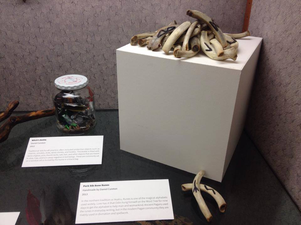A Look at Paganism Exhibition, Crafts-witches’ bottle and hand carved pork bone runes made by Muad’Dib, University of Utah J. Willard Marriott Library Level 1, January 17- March 16, 2014, Salt Lake City, UT