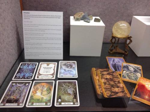 A Look at Paganism Exhibition, divination-Dragon Tarot by Terry Donaldson, Ogham on river stones, Faire Oracle by Brian Fraud, and a Citrine crystal ball, University of Utah J. Willard Marriott Library Level 1, January 17- March 16, 2014, Salt Lake City, UT