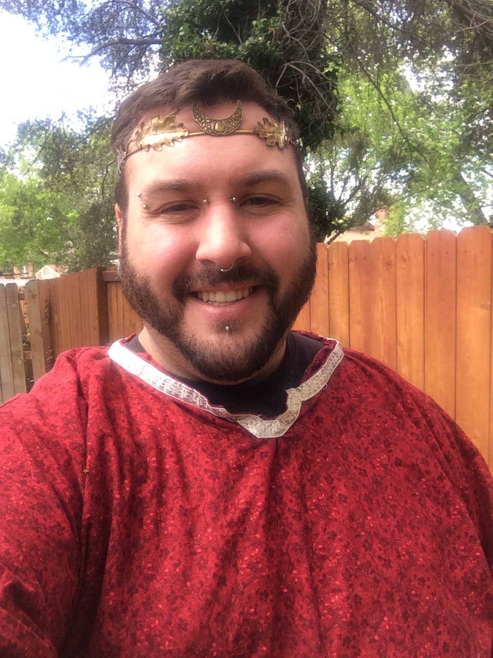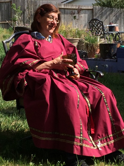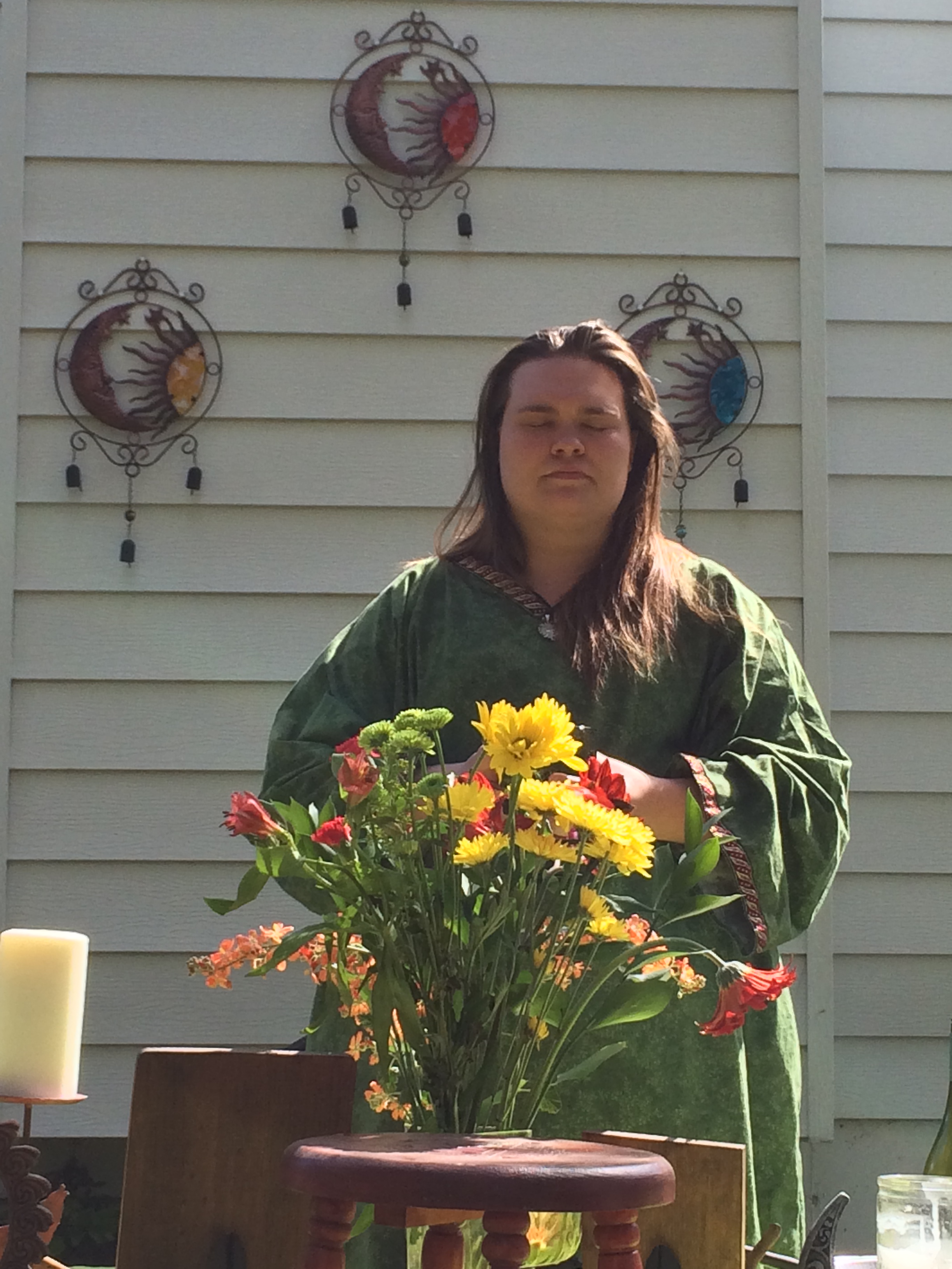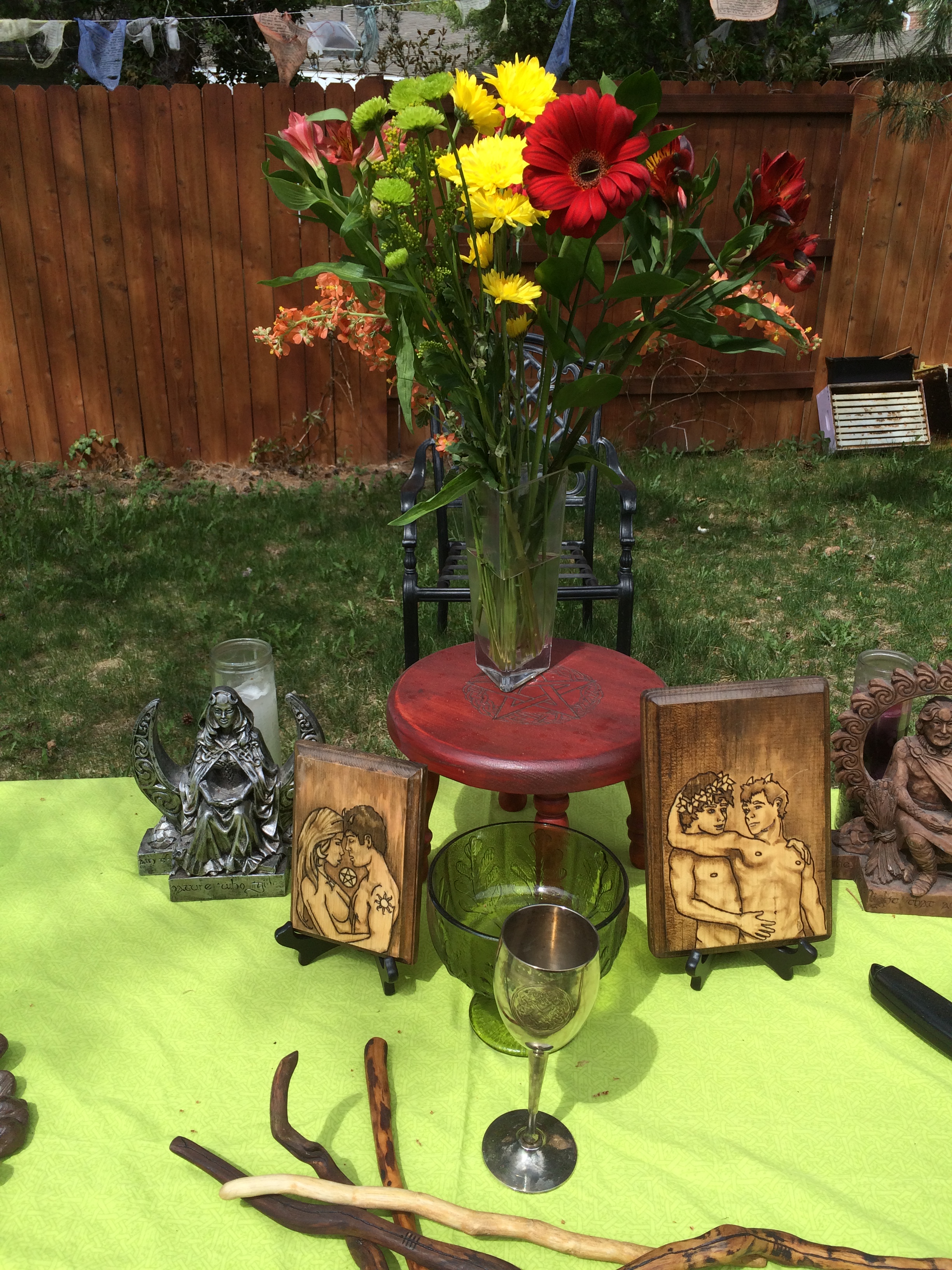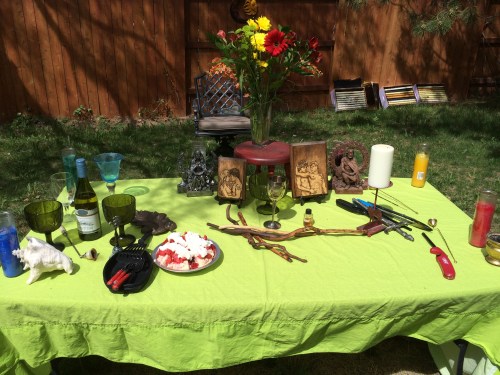 The Goddess and God united in love and became one for the day! The Great Day of Beltane, when the God and Goddess come together for their wedding ceremony and to make new life that will be born at Yule. The ceremony was held outside on a beautiful Sunday afternoon, May 3, 2015 at 3pm. The altar was decorated with Celtic knot work items and plaques of the Goddess and God and of the God and God for Queer mysteries. A lesson on the meaning and origin of Beltane took place, and the offerings were white wine and strawberry short cake. The feastings later in the evening were Italian sausage spaghetti, green salad, and garlic bread with red wine.