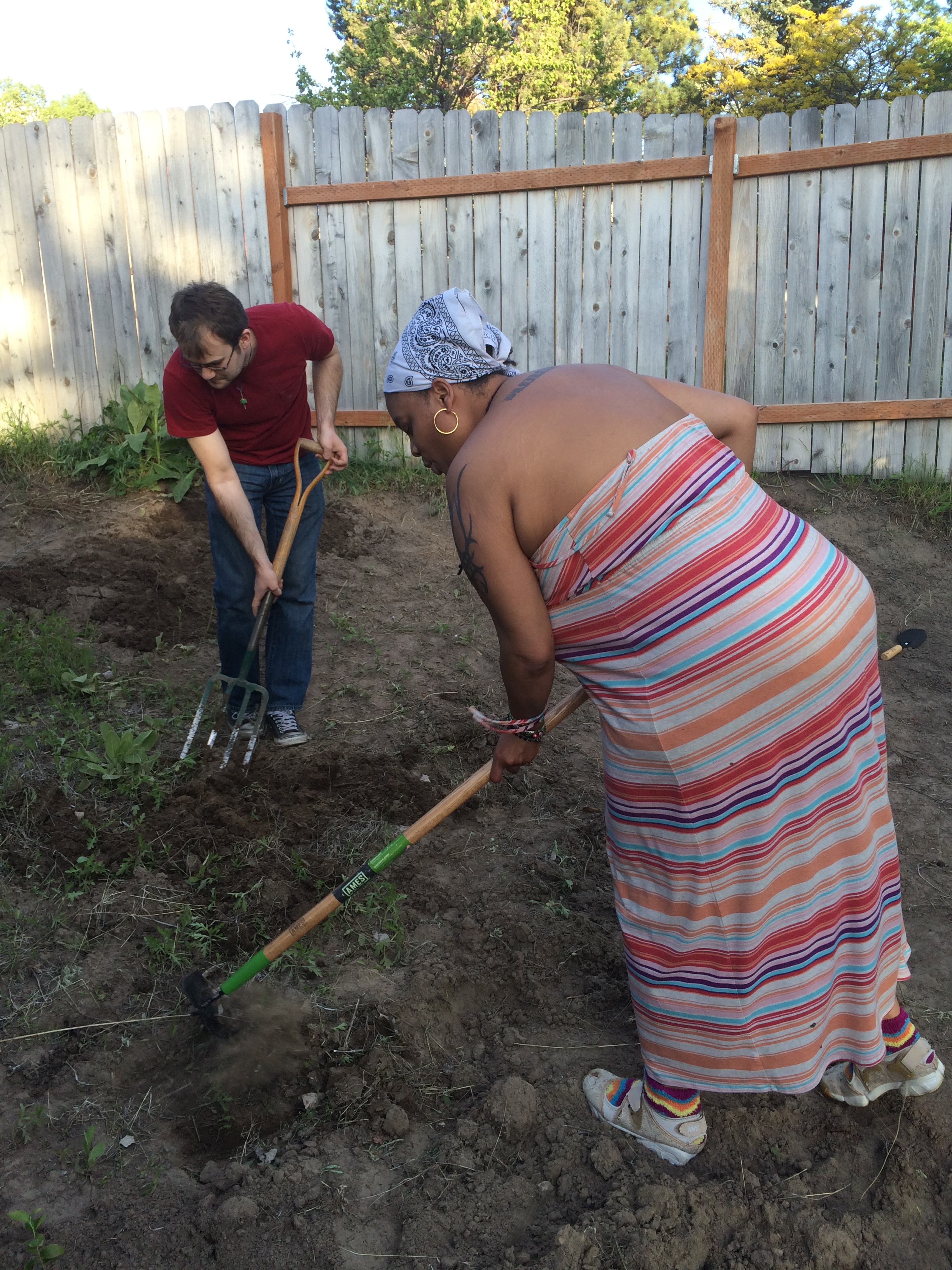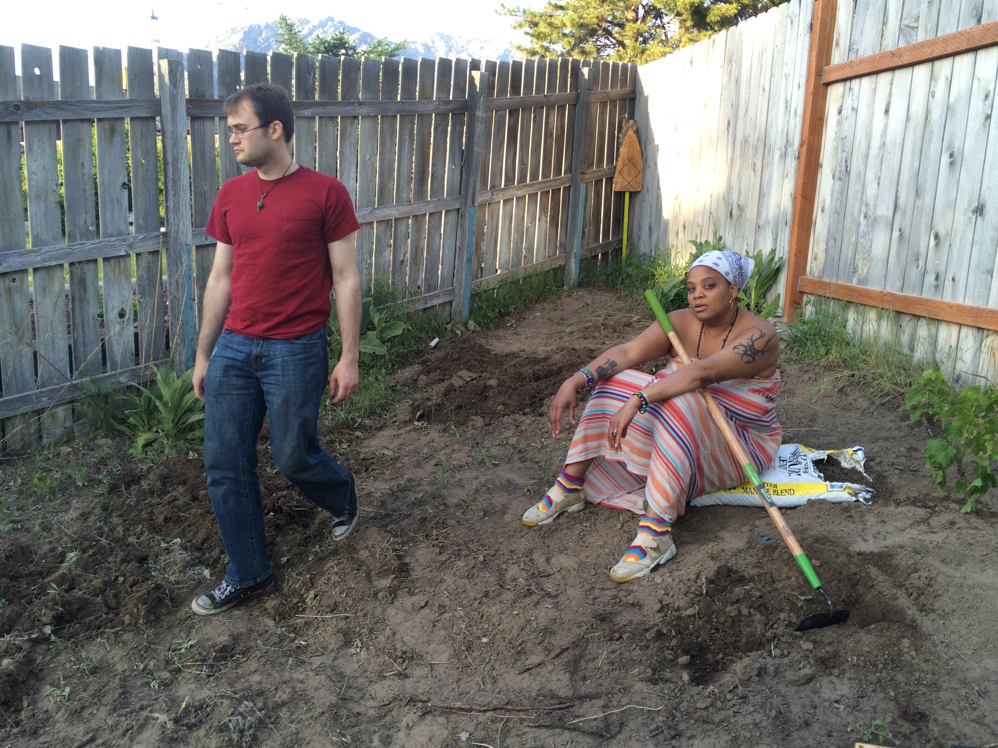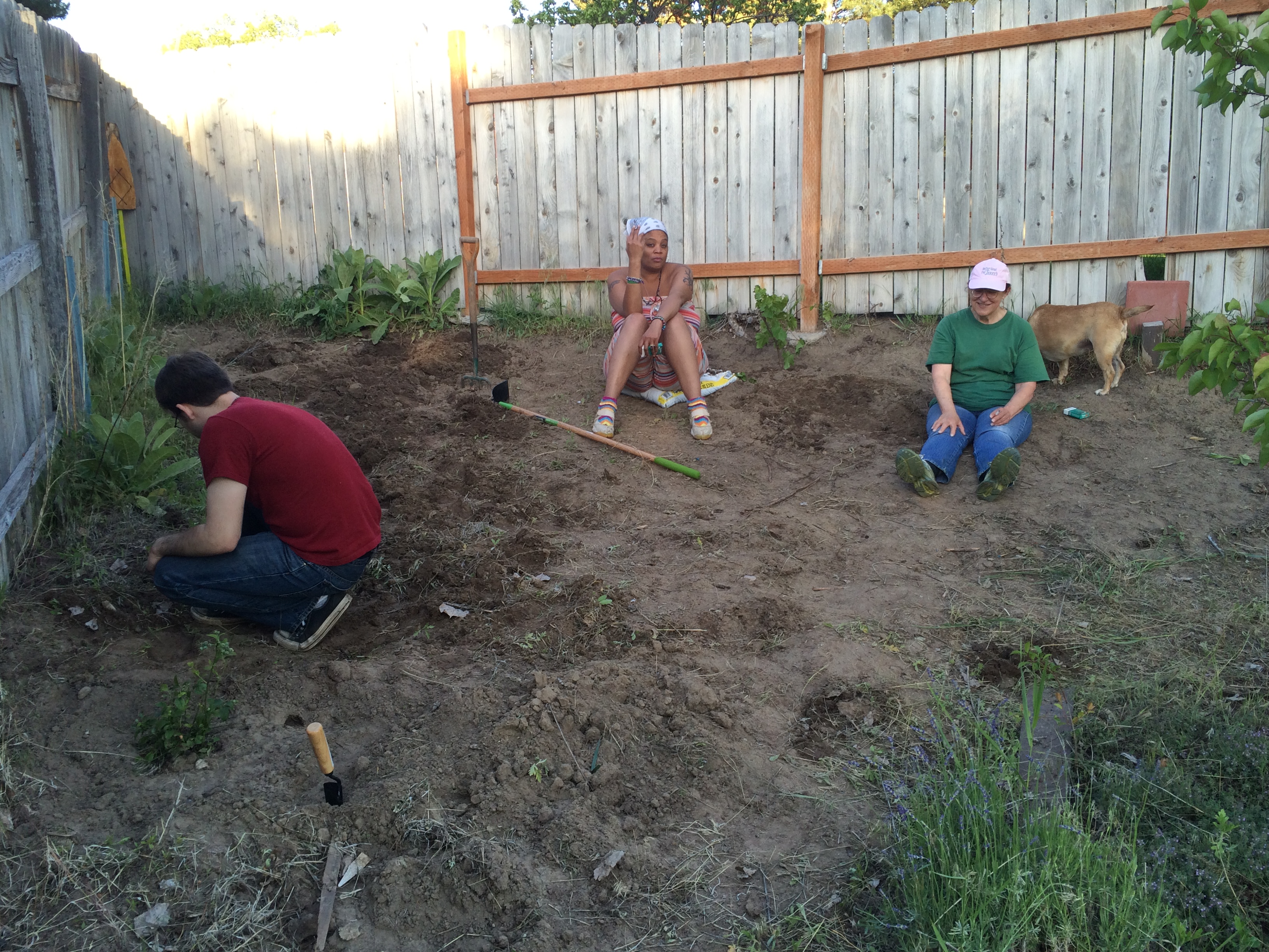 Blessed Be the Good Earth Mother and all her fertile soil. The new society garden has been planted and blessed this past week of May 24-31, 2015. Daniel Cureton, Ashton Longhurst, April Love, and Gwen Allen with the house dog Freyja worked hard over the last week to weed, turn the soil for roots, add manure, plant the crop and water the garden. “It was back breaking work. Most of it was the weeding with hoes and turning the soil with the cultivating forks, that took the whole week.” Said Ashton Longhurst. Gwen Allen commented “my African blood was pumping strong. We were out there working like slaves! Real strong, I was feelin akin to the brothas and sistas from home in the Deep South workin the plantations”