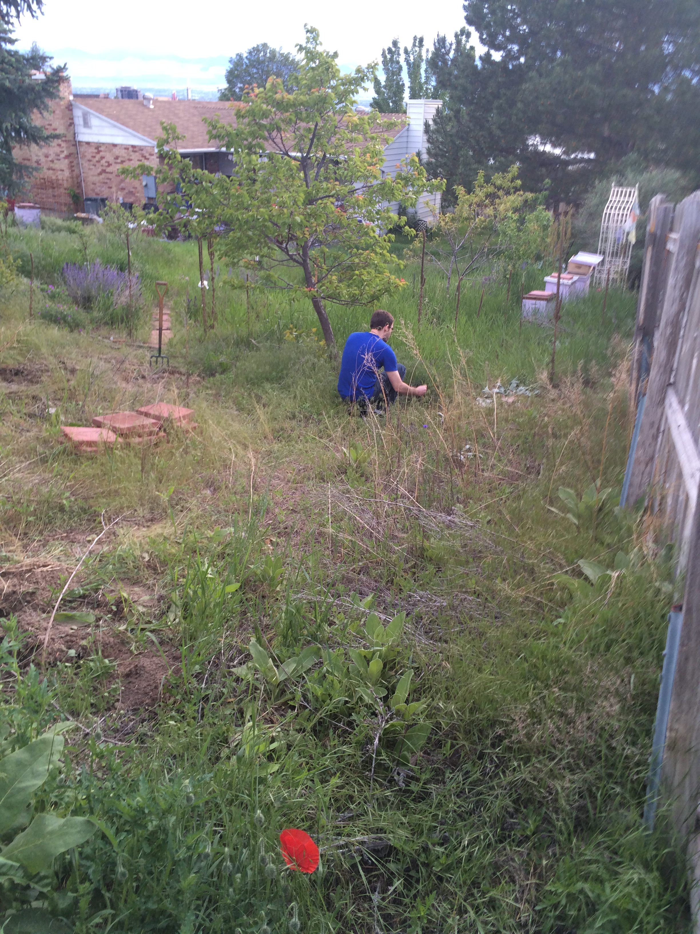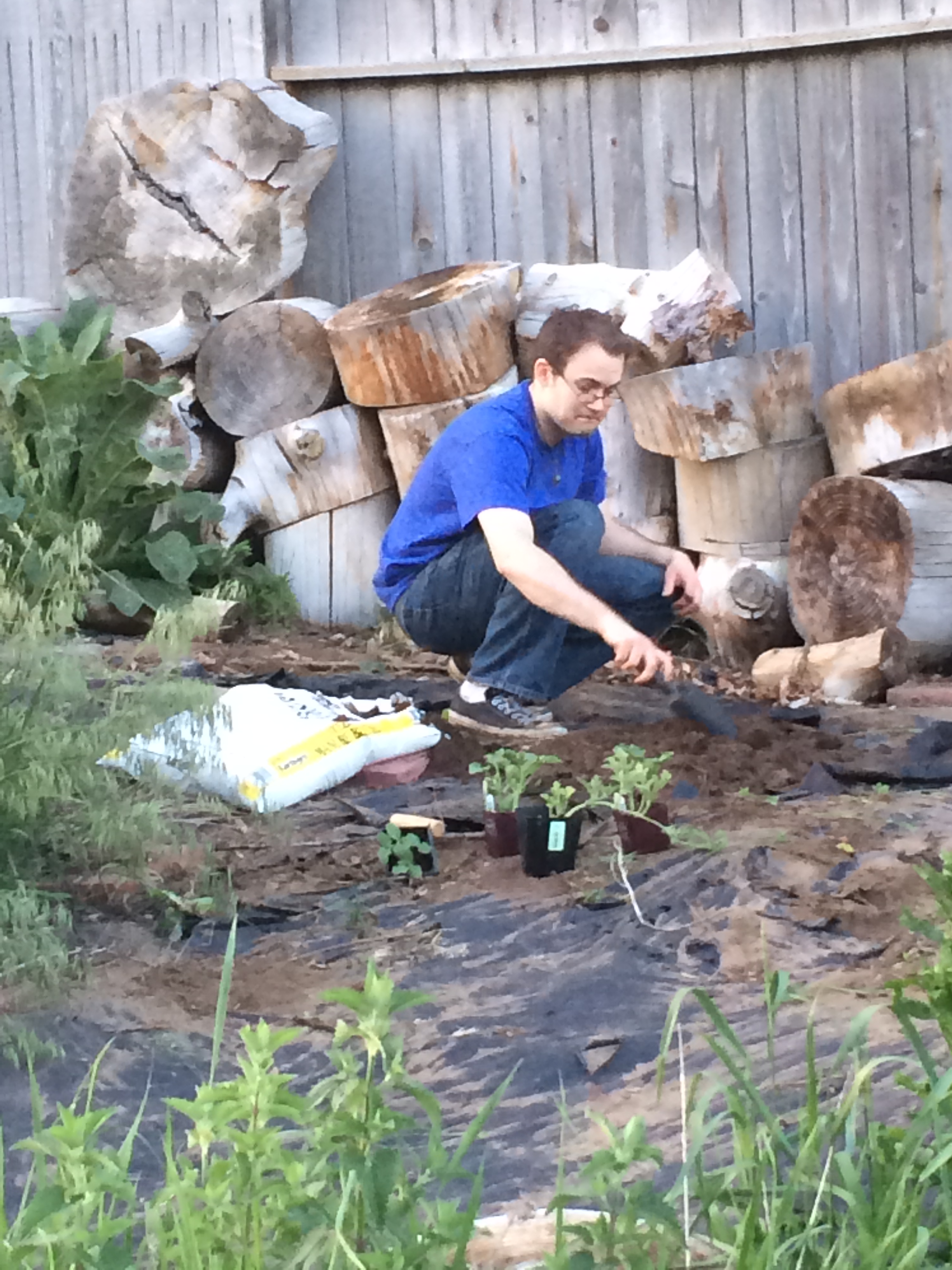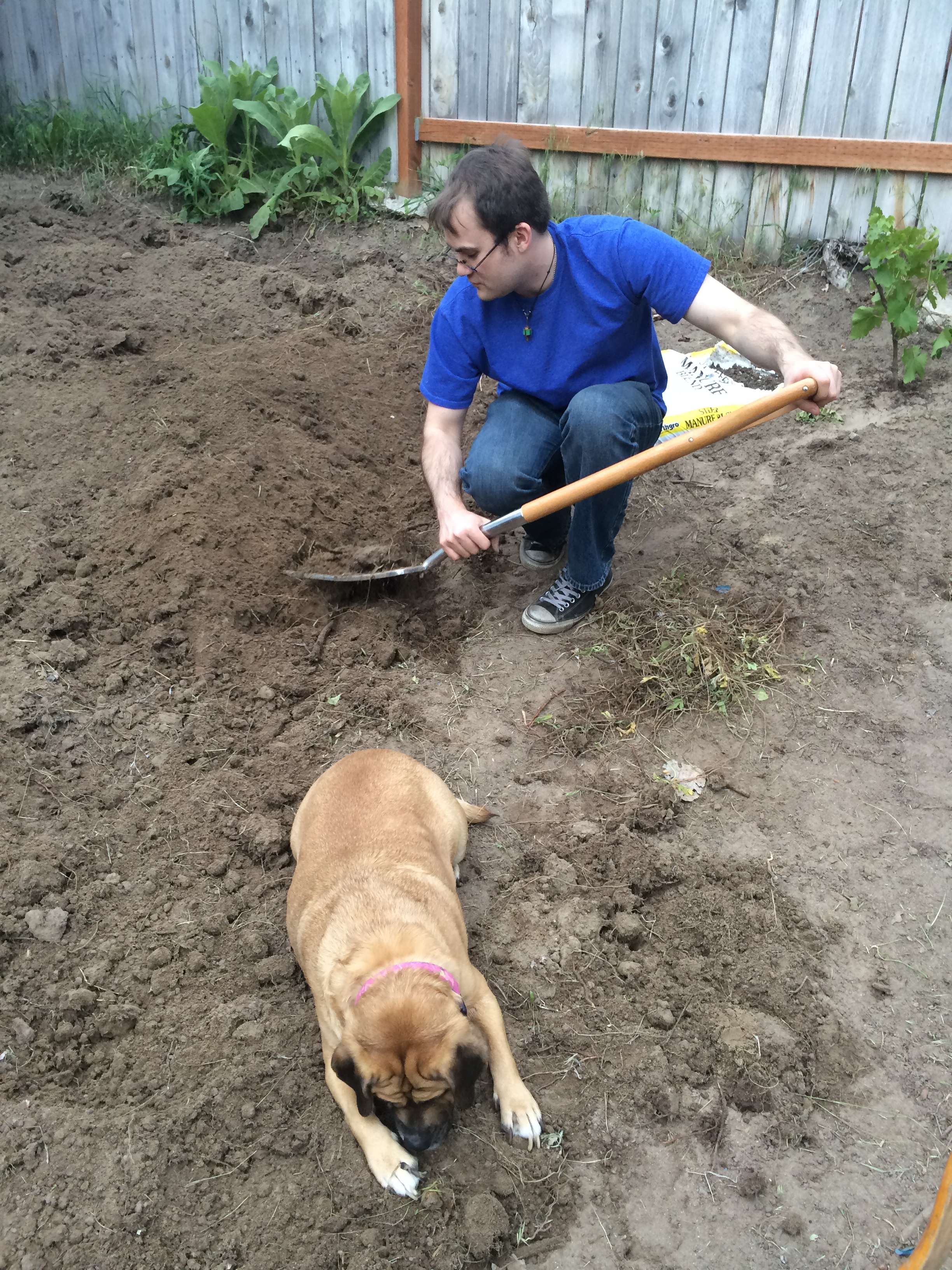 Blessed Be the Good Earth Mother and all her fertile soil. The new society garden has been planted and blessed this past week of May 24-31, 2015. Daniel Cureton, Ashton Longhurst, April Love, and Gwen Allen with the house dog Freyja worked hard over the last week to weed, turn the soil for roots, add manure, plant the crop and water the garden. “It was back breaking work. Most of it was the weeding with hoes and turning the soil with the cultivating forks, that took the whole week.” Said Ashton Longhurst. Gwen Allen commented “my African blood was pumping strong. We were out there working like slaves! Real strong, I was feelin akin to the brothas and sistas from home in the Deep South workin the plantations”