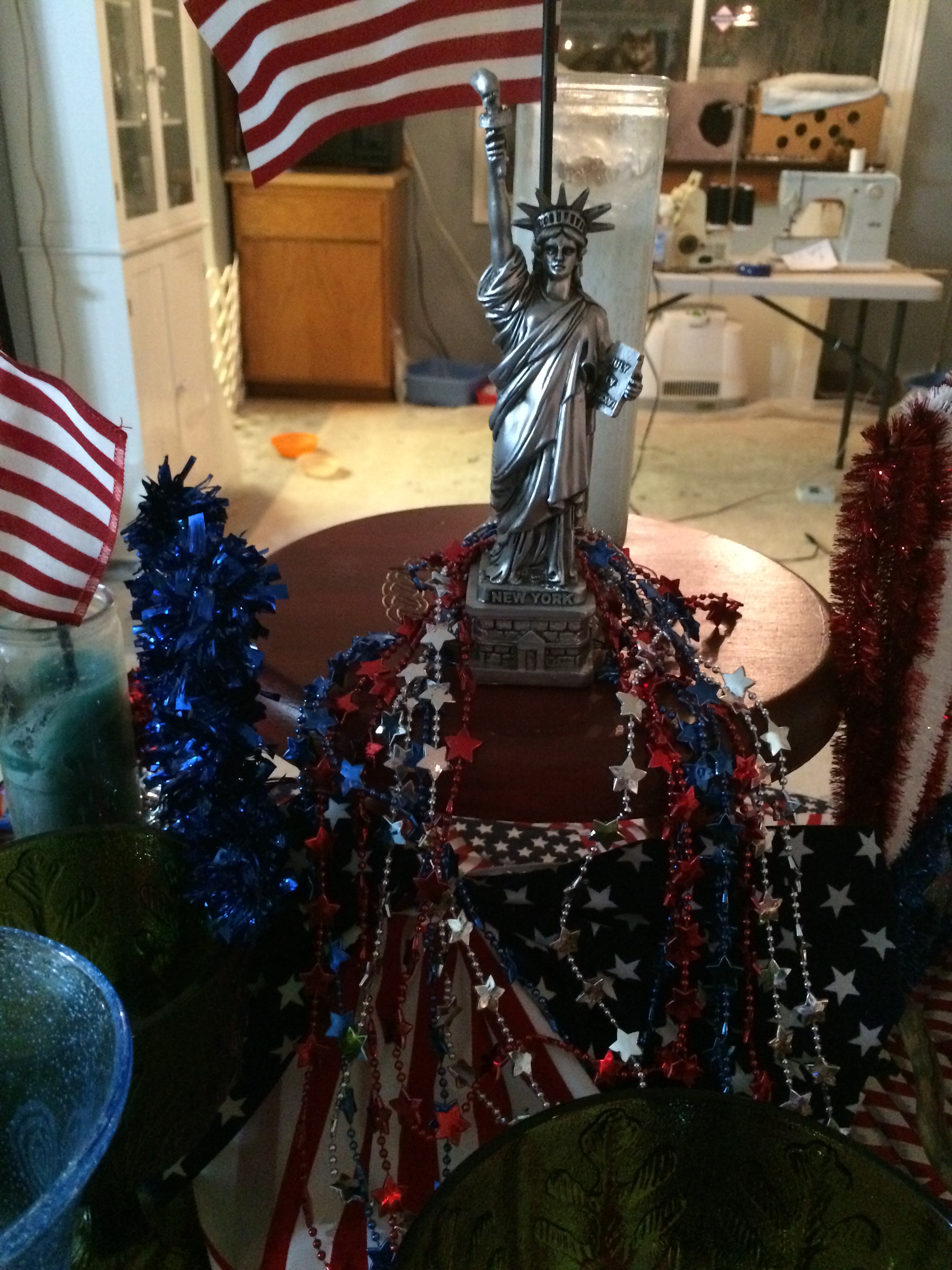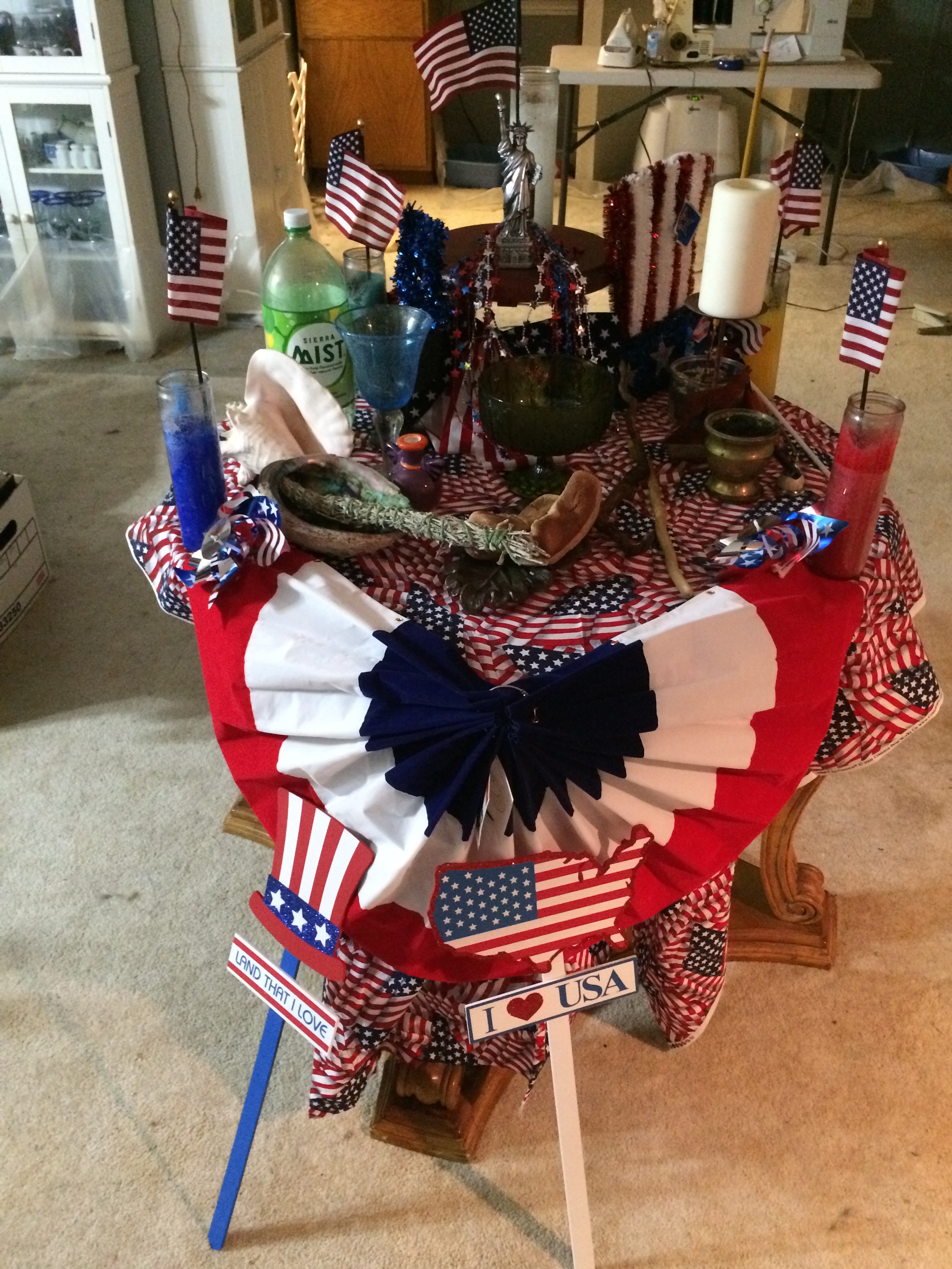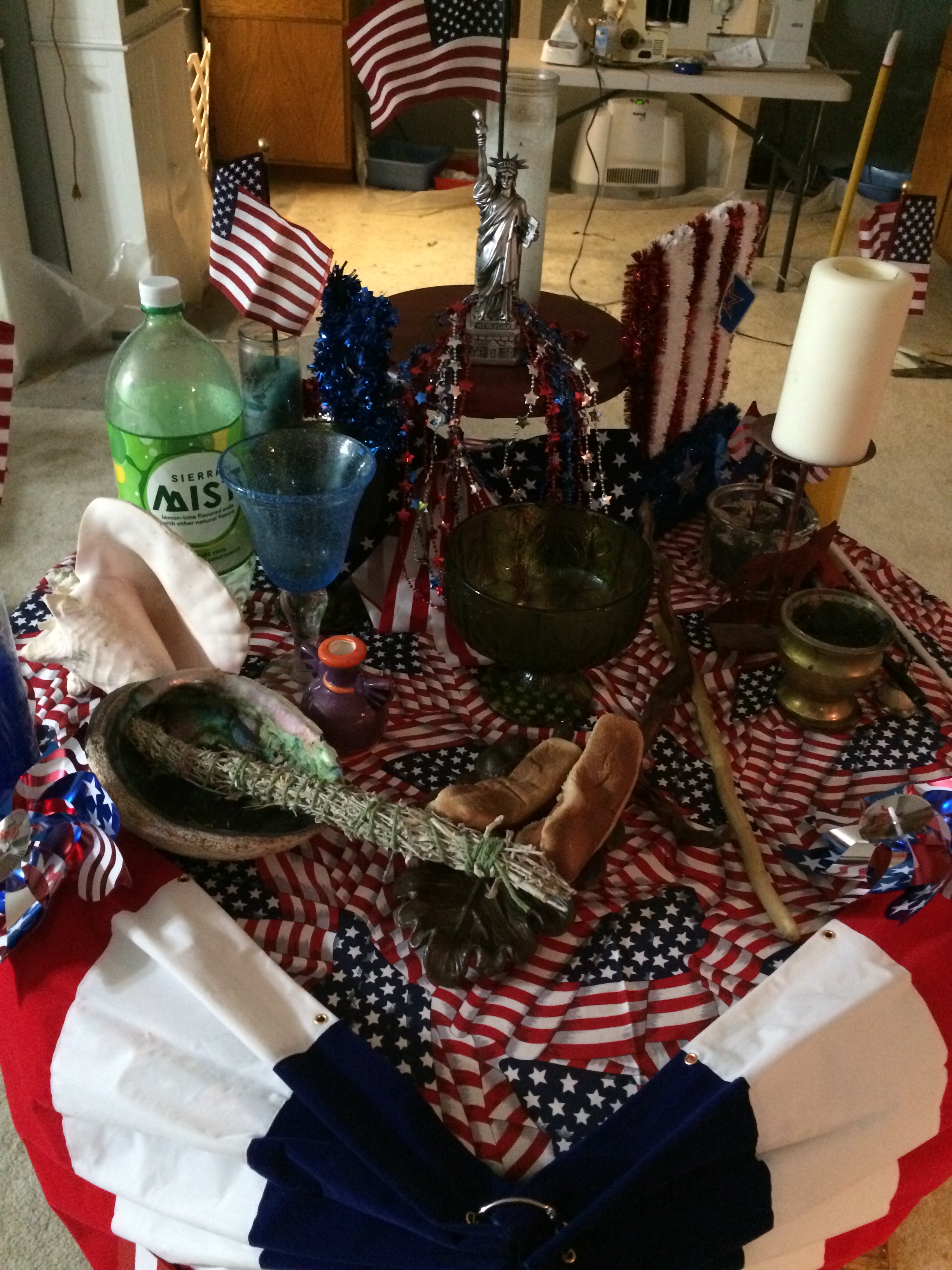 June 2015 Full Moon Ritual for July 4th to Goddess of America Columbia, altar center with hot dog offerings, Saturday, June 27, 2015, Salt Lake City, UT