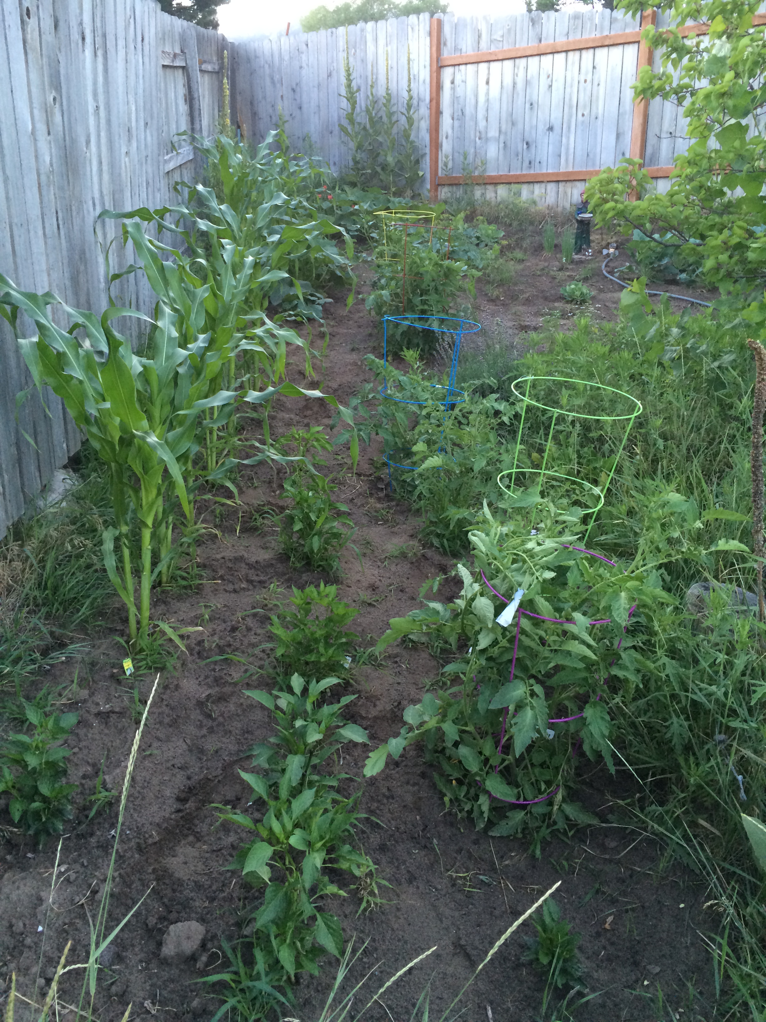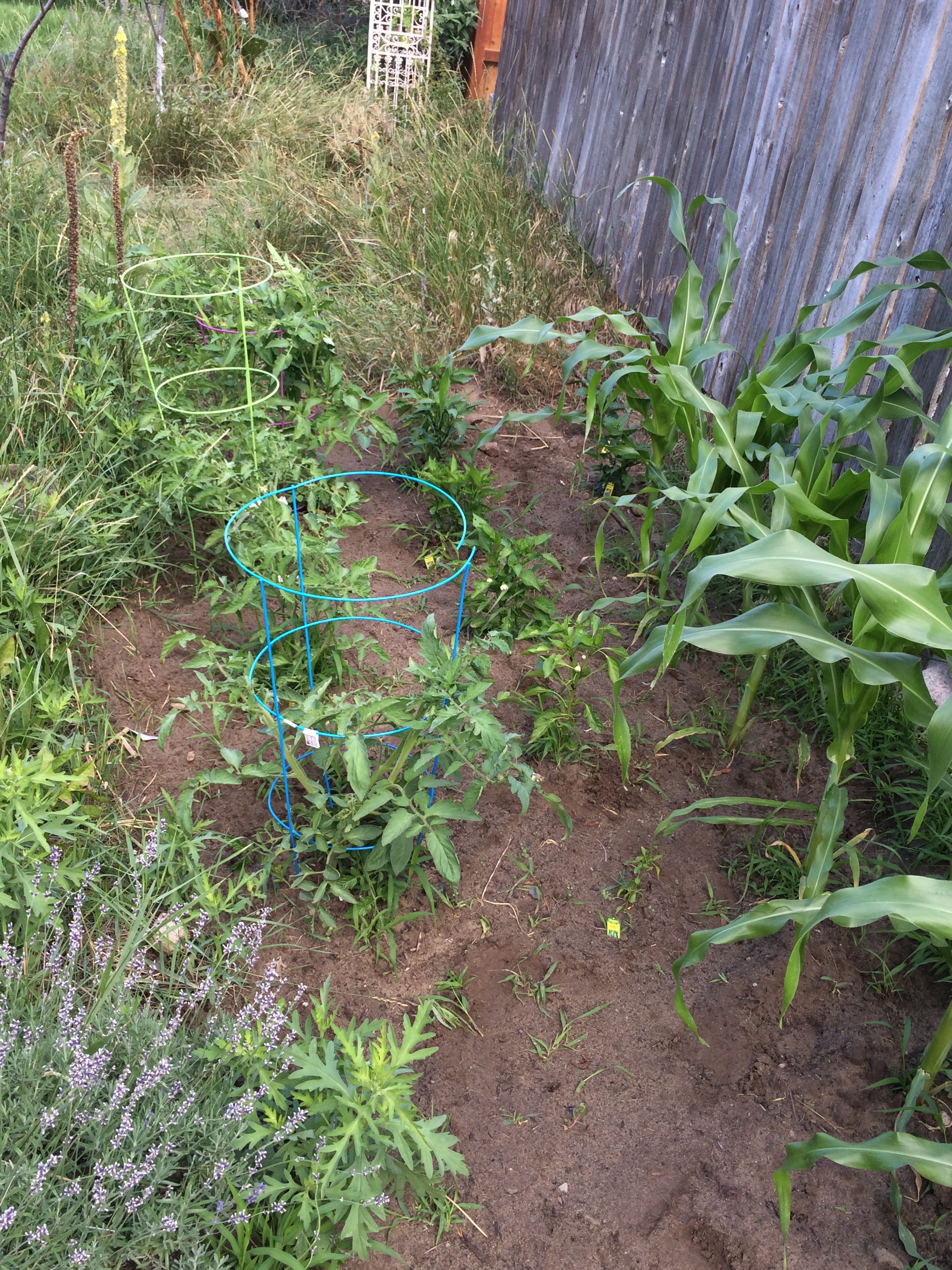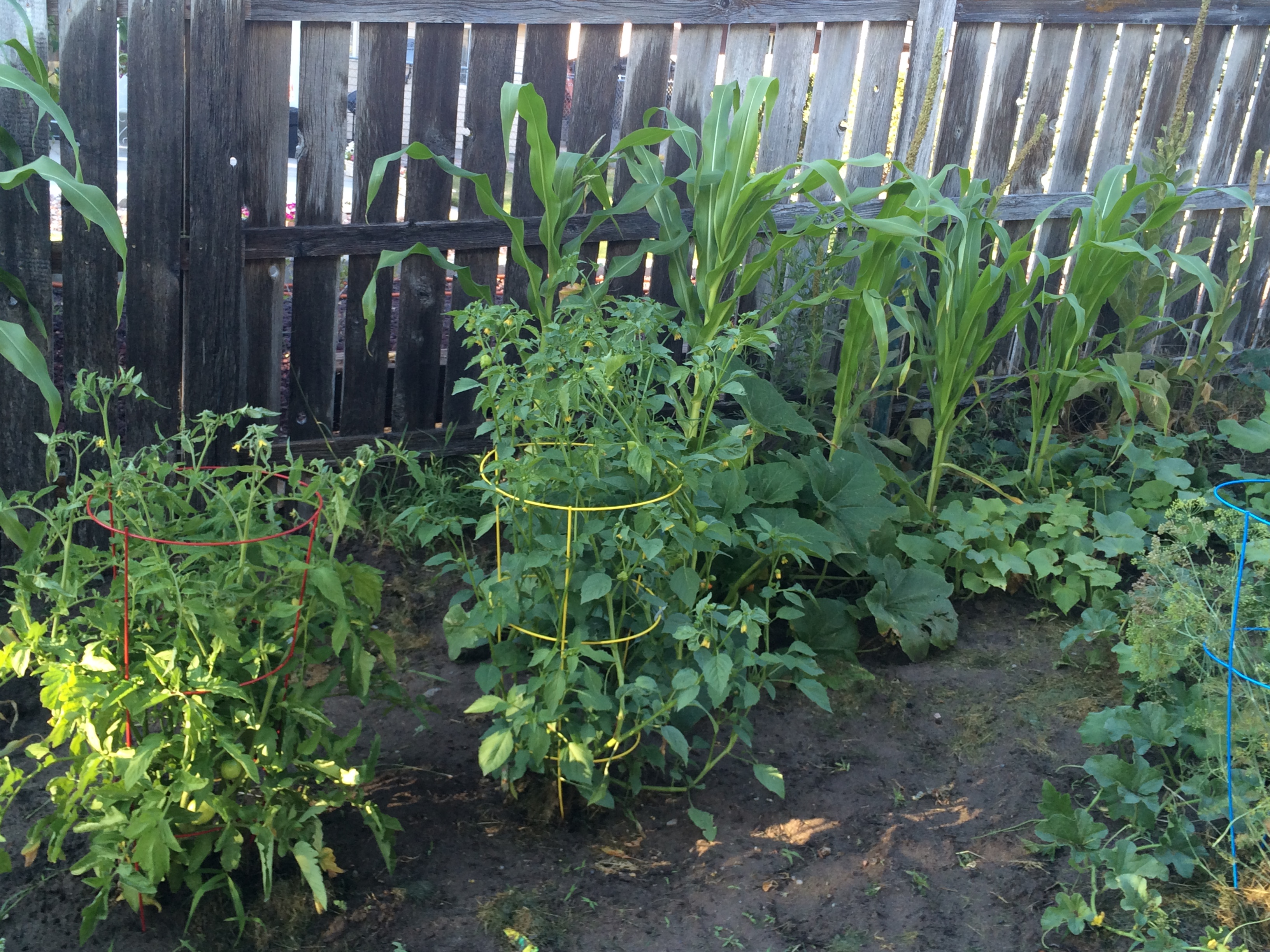Society Garden 2015, l to r: corn, tomato, tomatillo, cucumber, Friday, July 10, 2015, Salt Lake City, UT
