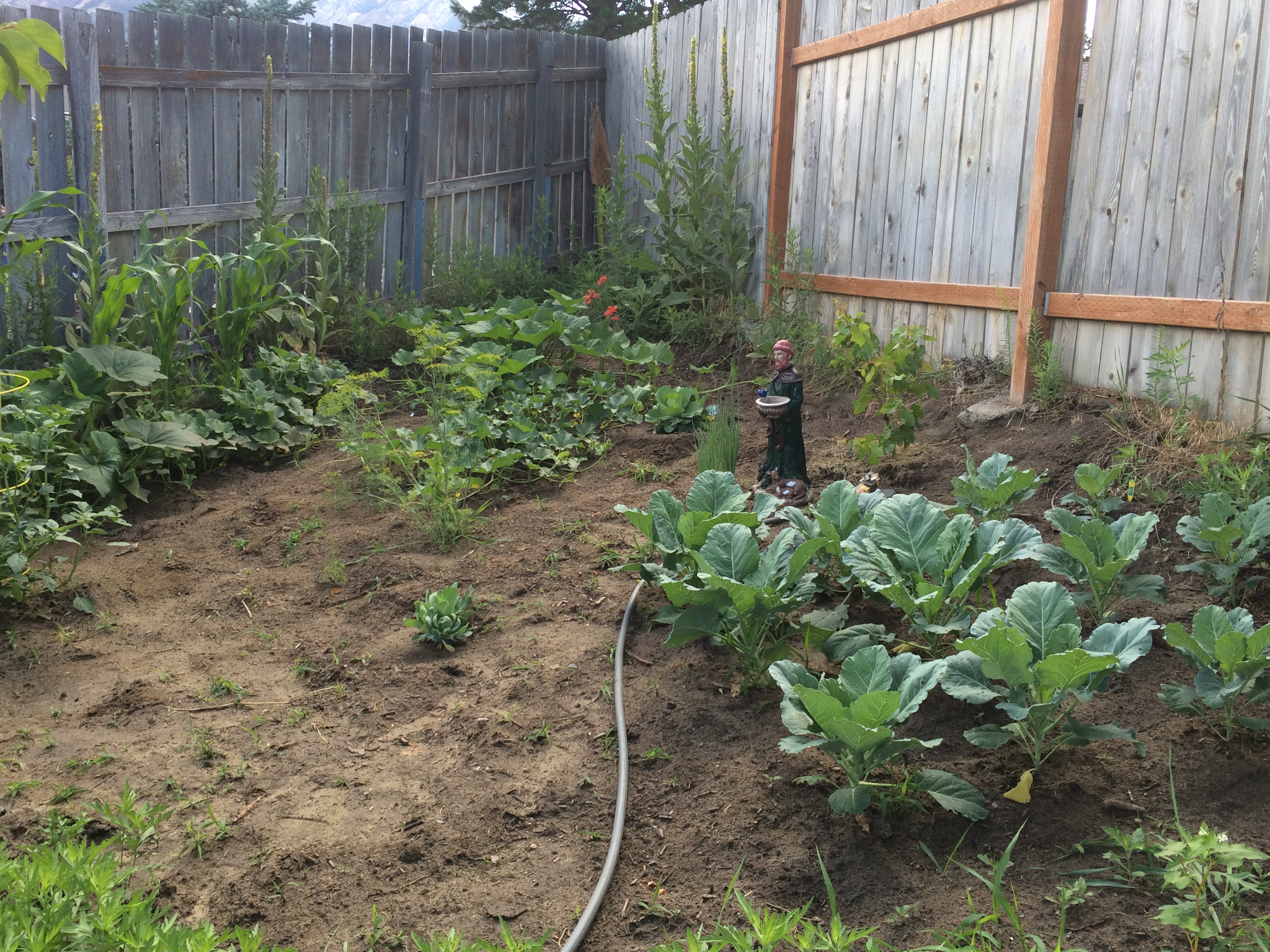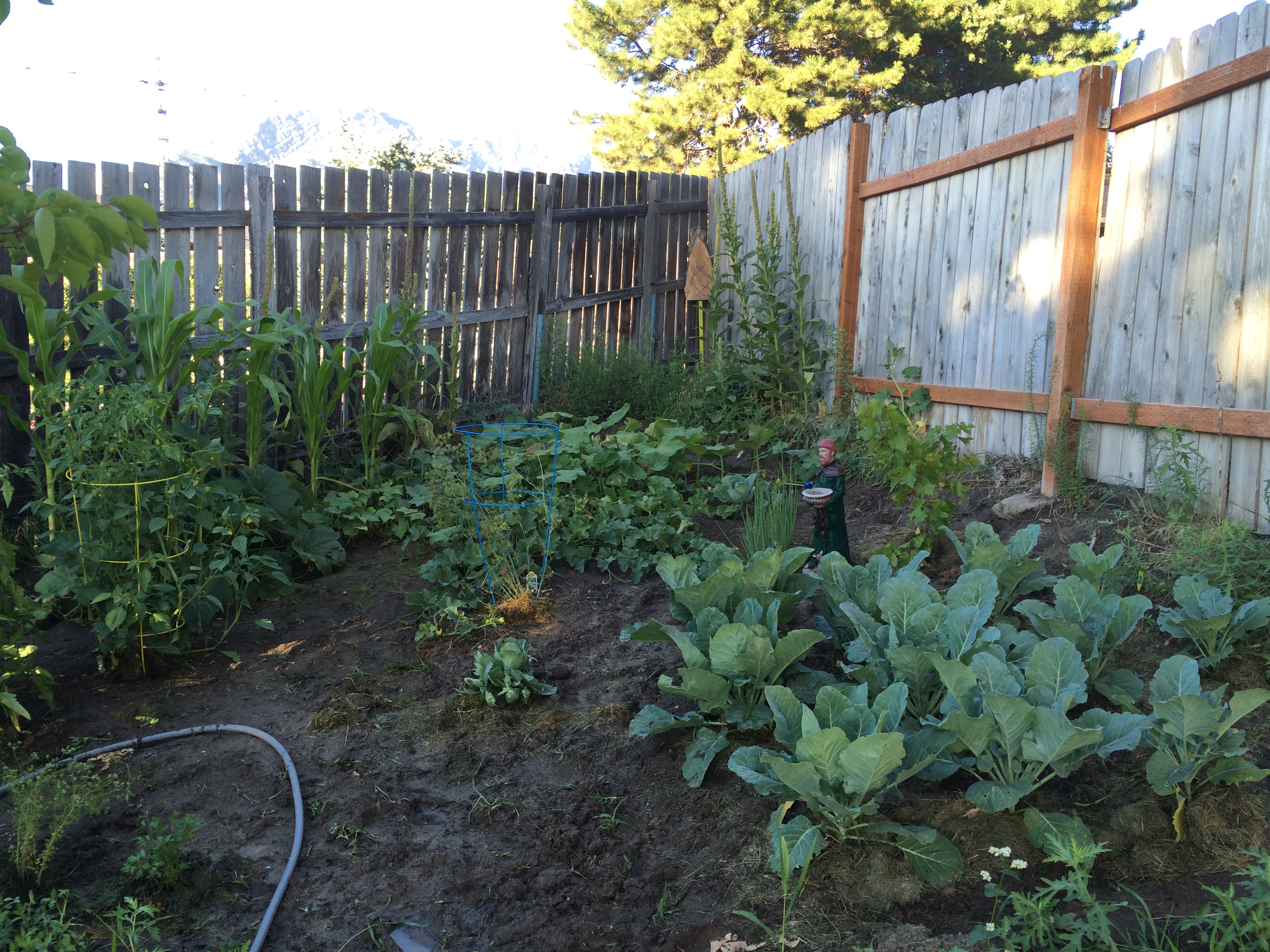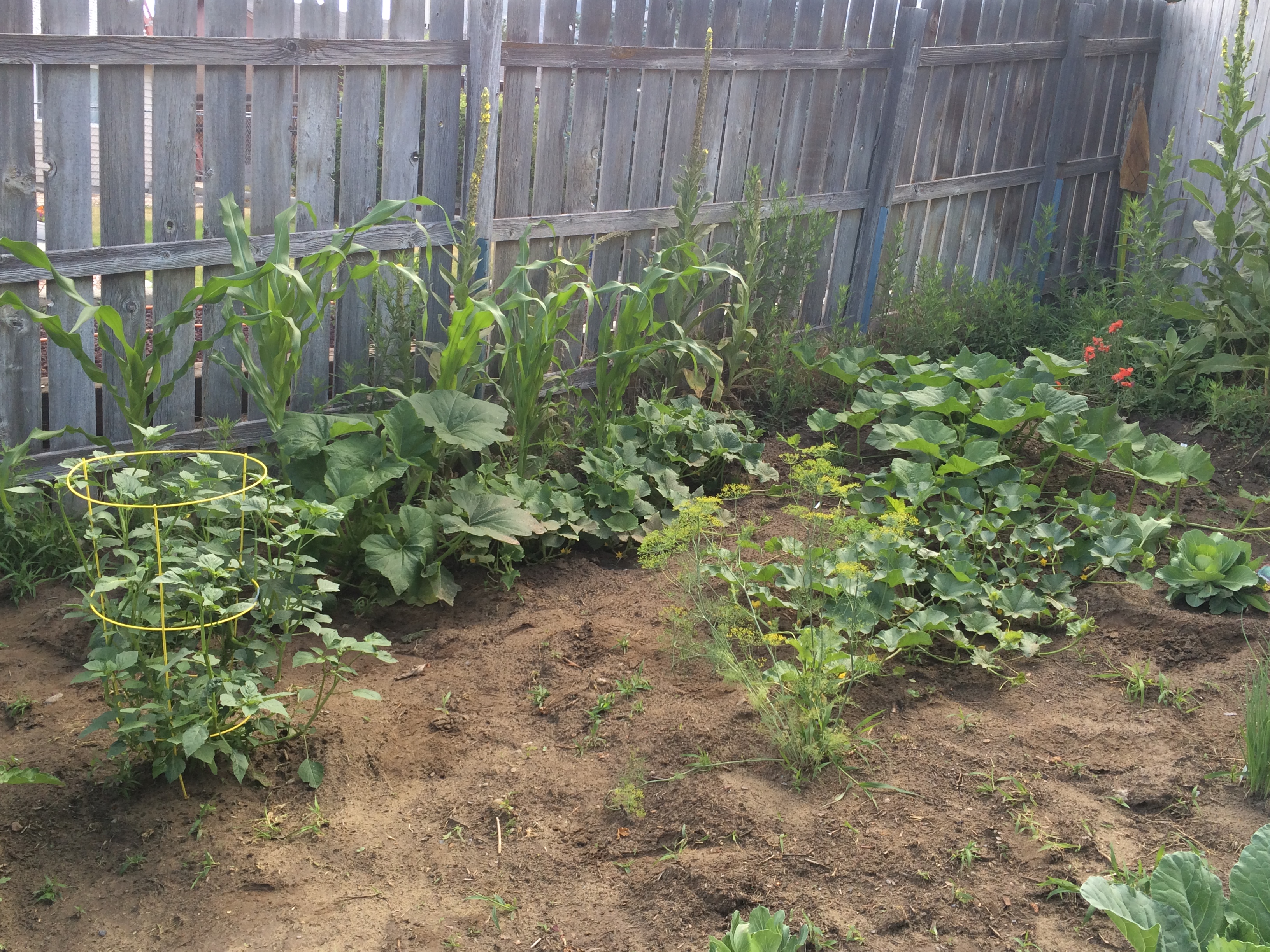 Society Garden 2015, l to r: tomatillo, corn, yellow squash, cucumber, dill, cabbage, cantaloupe, butternut squash, collard greens, St. Francis, green onion, grapeThursday, July 24, 2015, Salt Lake City, UT