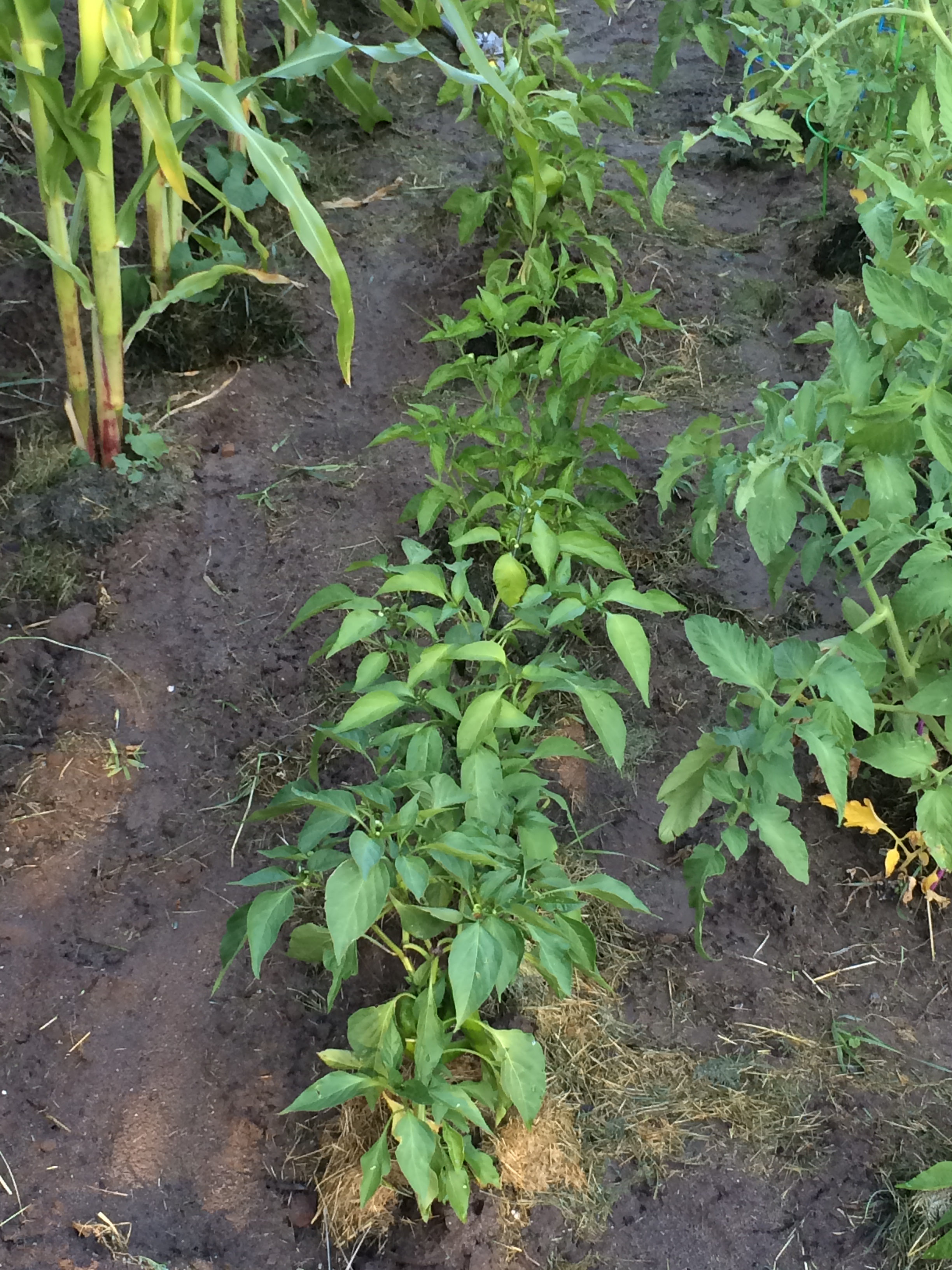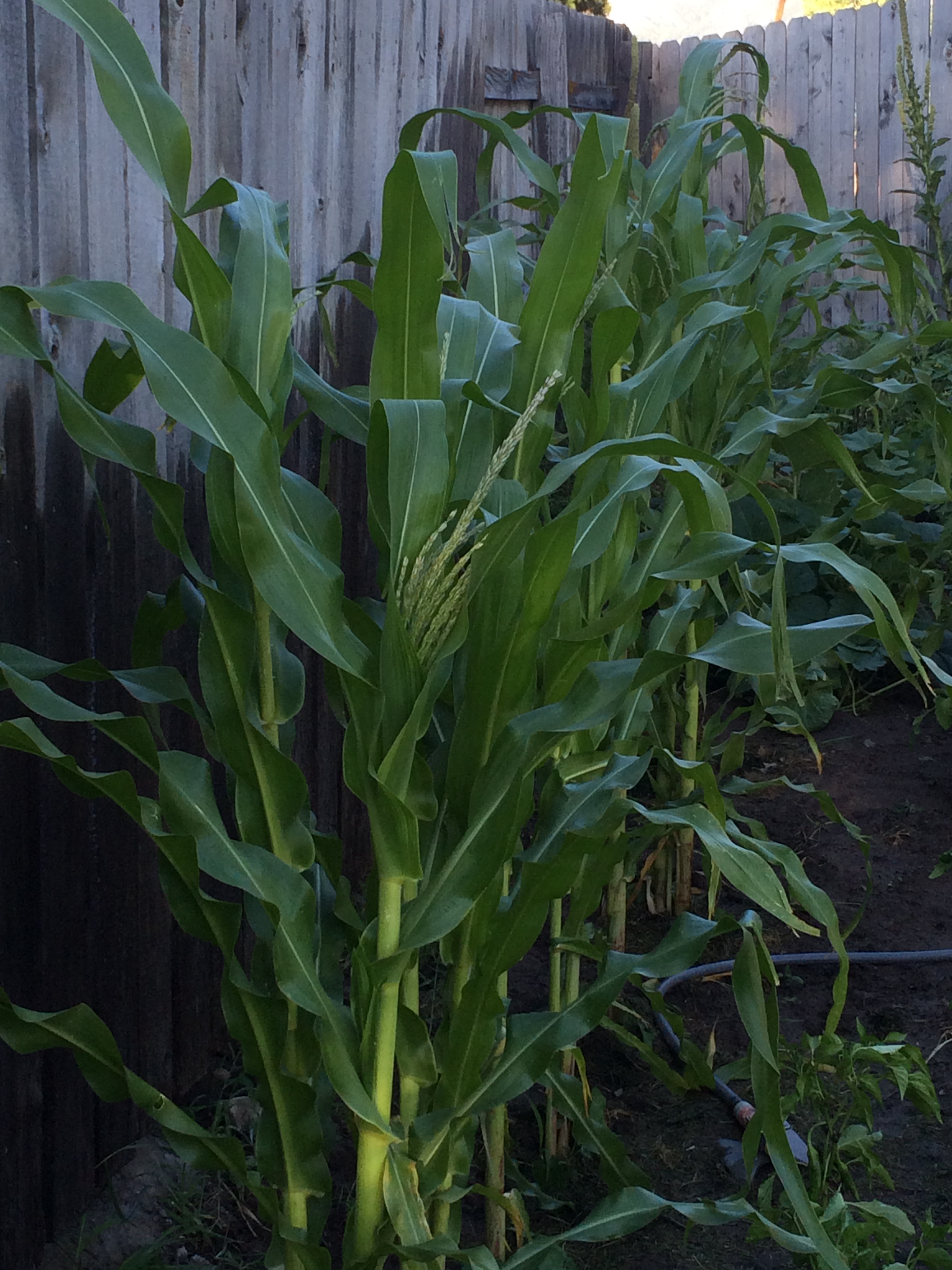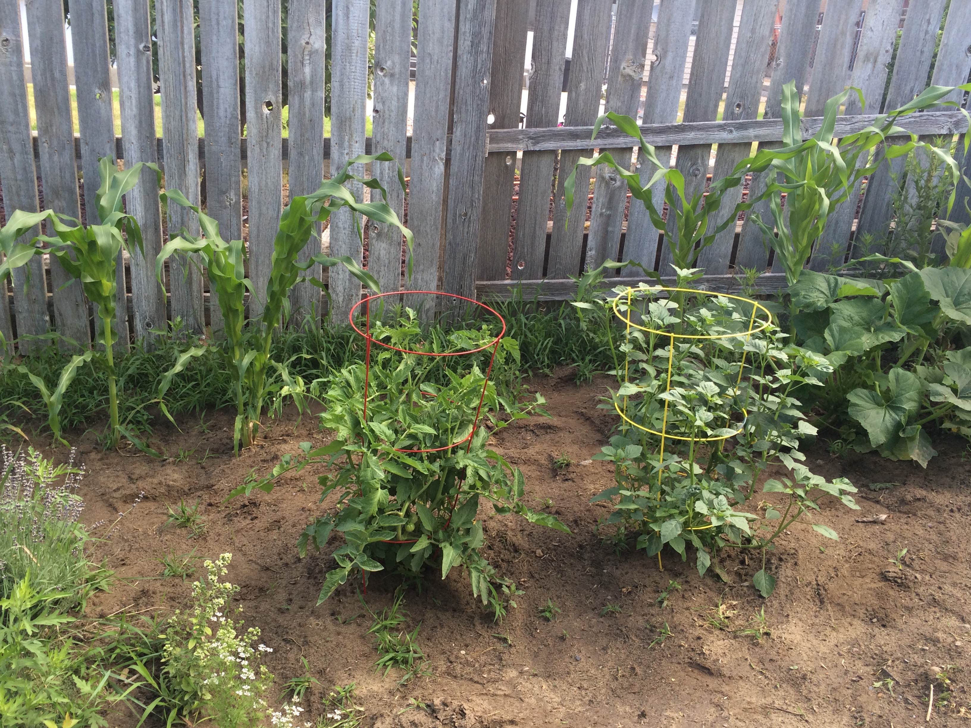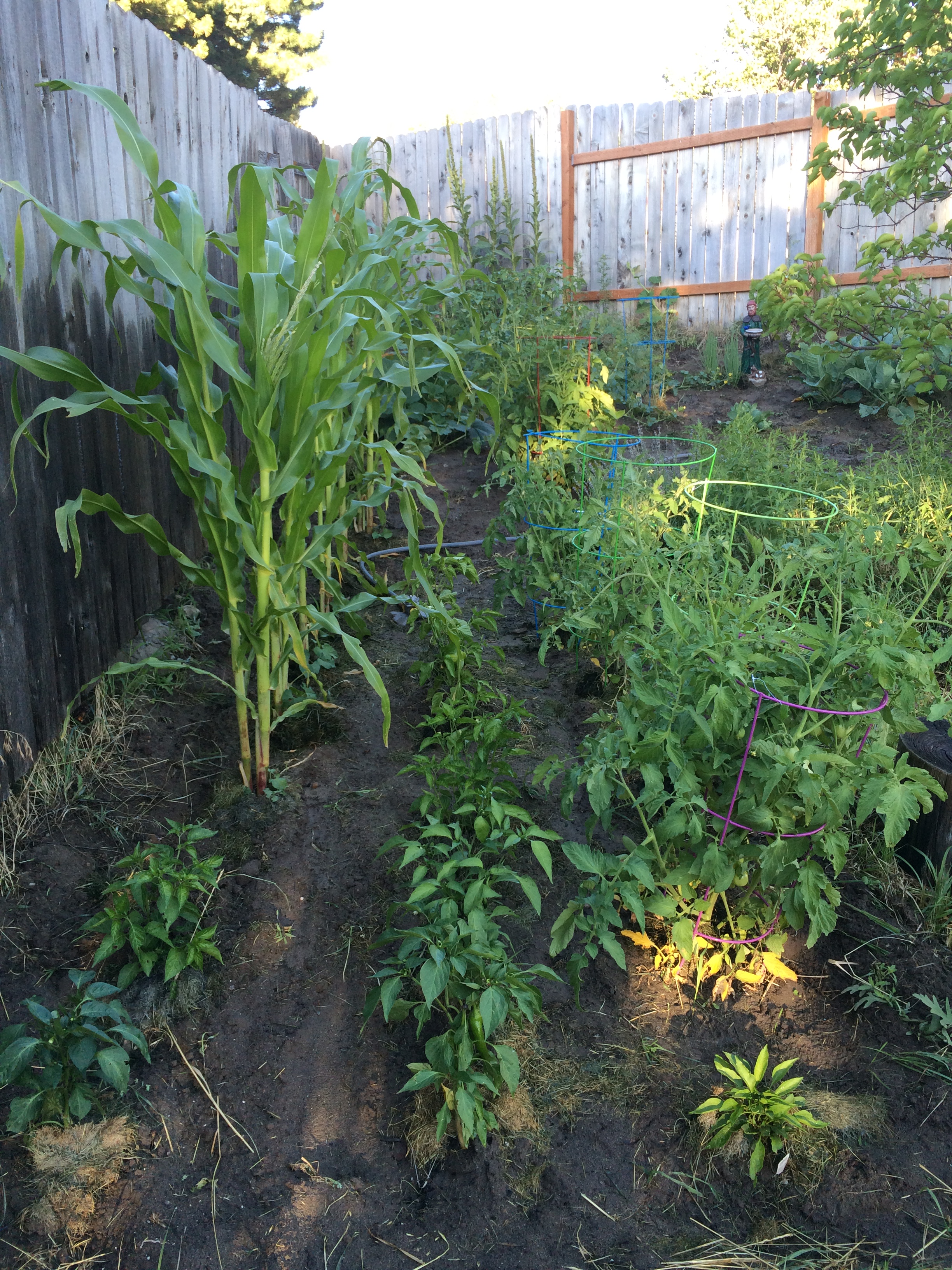 Society Garden 2015, l to r: corn, beans, peppers, tomato,Thursday, July 24, 2015, Salt Lake City, UT