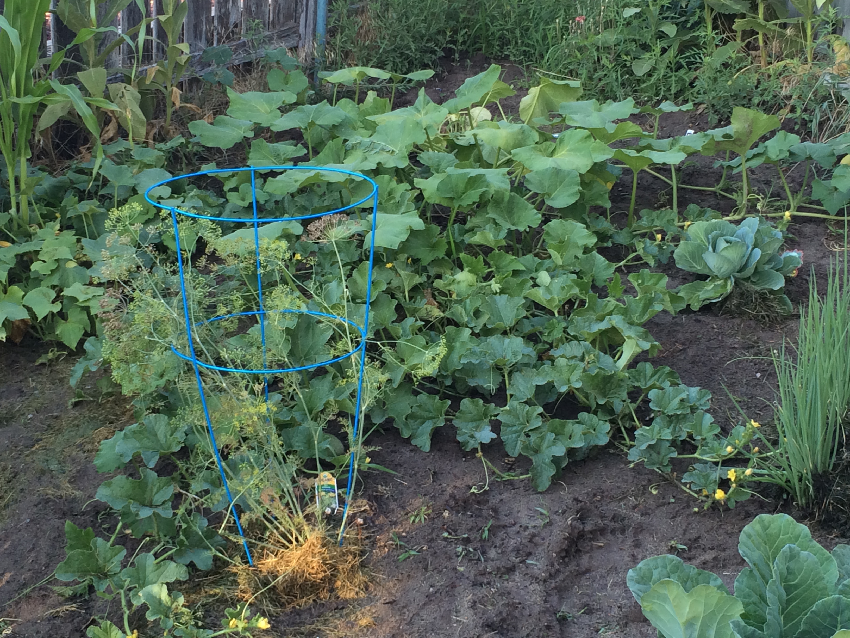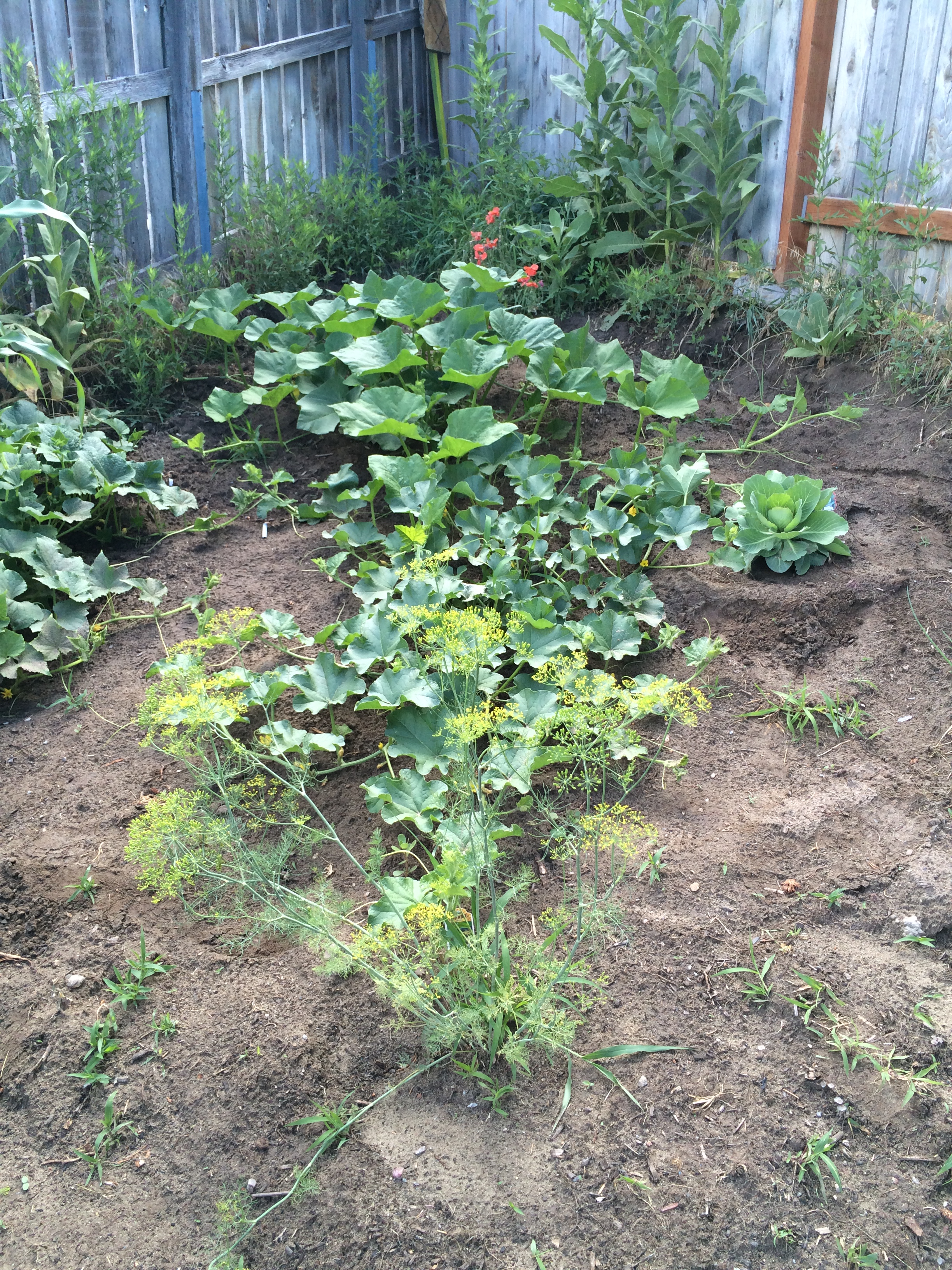 Society Garden 2015, l to r : cucmber, dill, butternut squash, cantaloupe, cabbage, Friday, July 10, 2015, Salt Lake City, UT