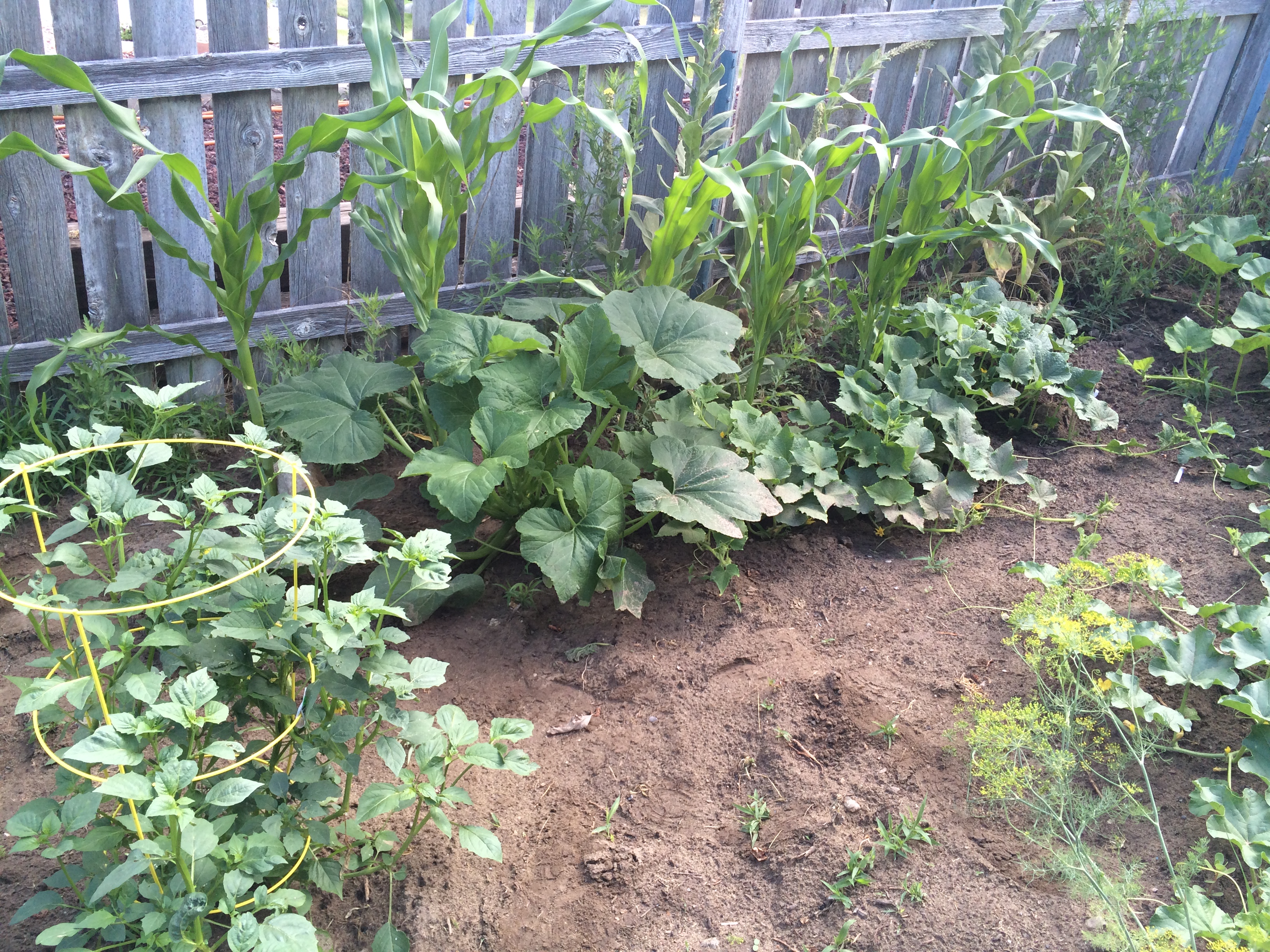 Society Garden 2015, l to r: tomatillo, corn, yellow squash, cucumber, dill, butternut squash, Friday, July 10, 2015, Salt Lake City, UT