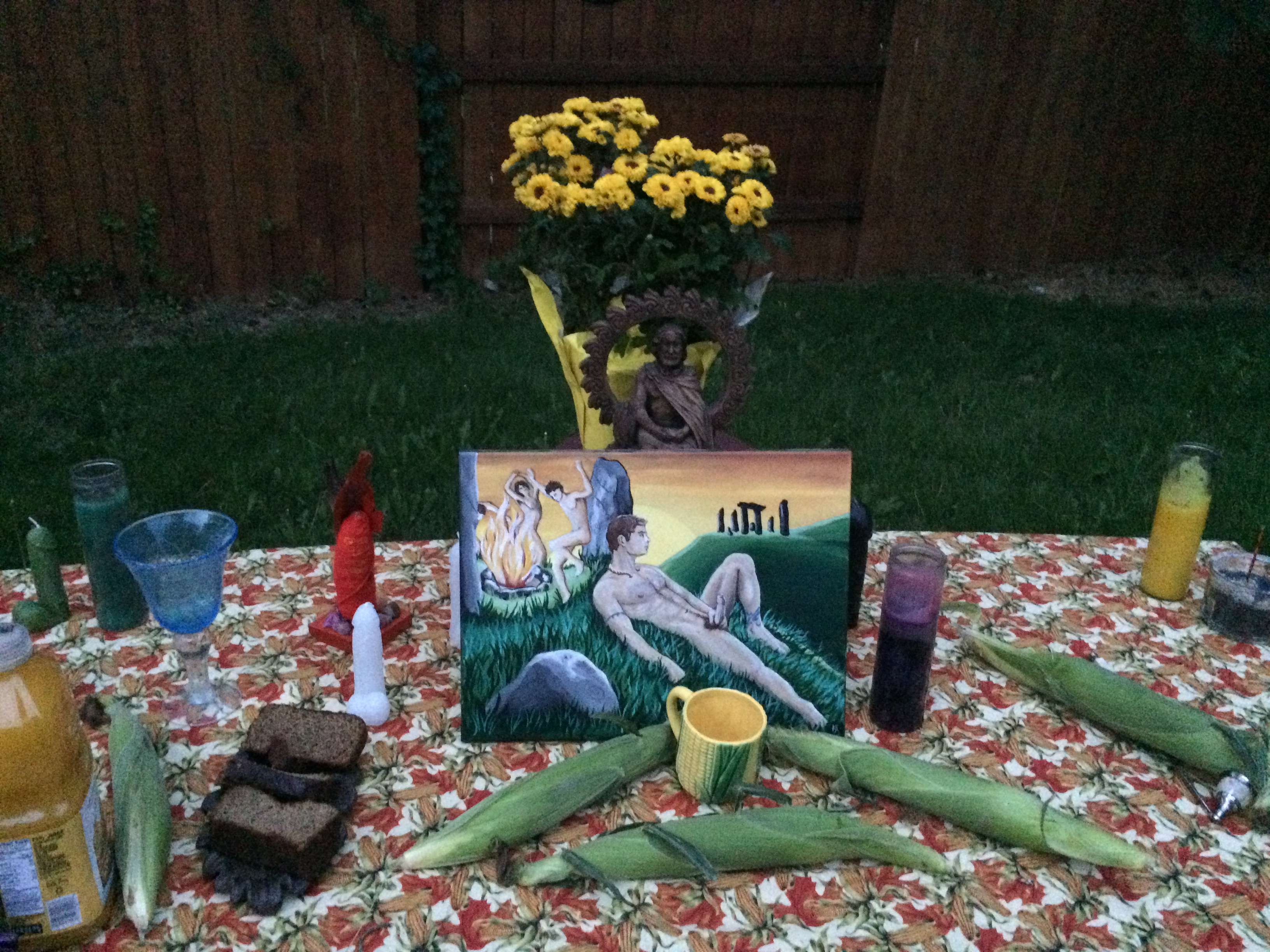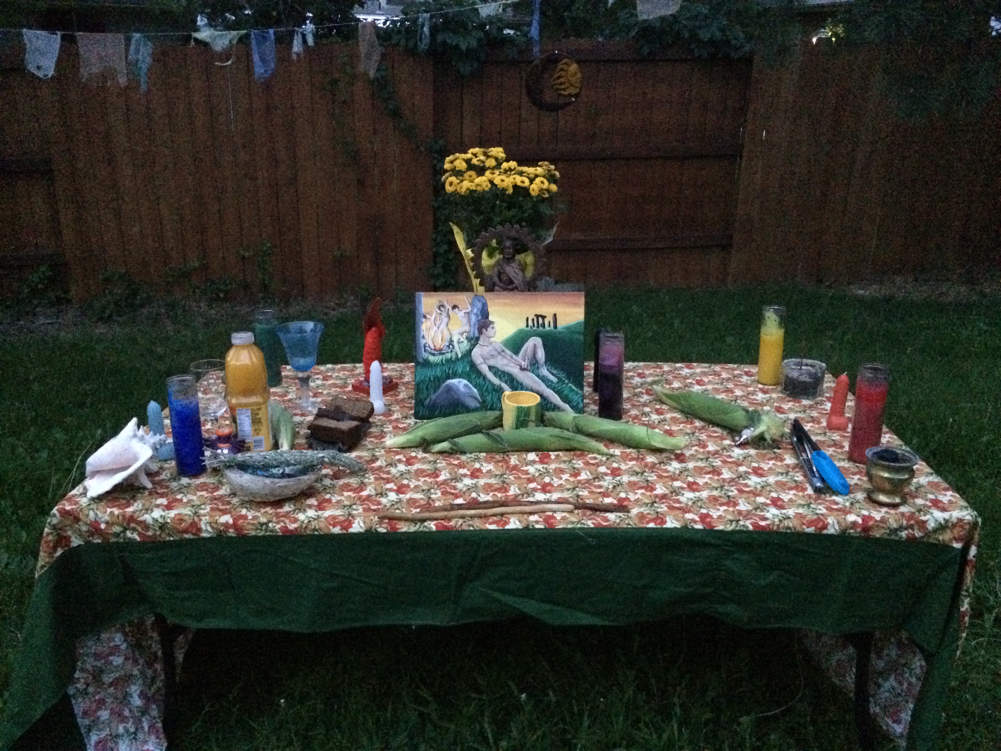 The sun was setting in the west when SLPS celebrated Lughnasadh. The ritual took place Sunday, August 2, 2015 at 8pm. SLPS is fond of honoring the Celtic Sun God Lugh, as he’s been so good to us. Corn was in order, and bread the offering. A simple ritual giving thanks, creating sacred space, and discussing what we are all thankful for took place. Ears of corn and chrysanthemums decorated the altar, and the song “Heart Beat of Harvest” by Cernunnos Rising was sung in honor of Lugh. John Barleycorn was burned in the fire, and the feast included bowls of hardy chili and mango nectar.