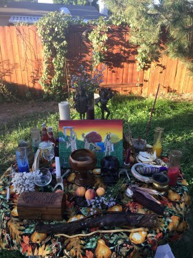 Offerings were given-seasonal fruits adorned the altar. Allegiances pledged while asking for guidance during this waning time. Kali Ma and Cernunnos were present to guide the attendees and give advice for the coming months.