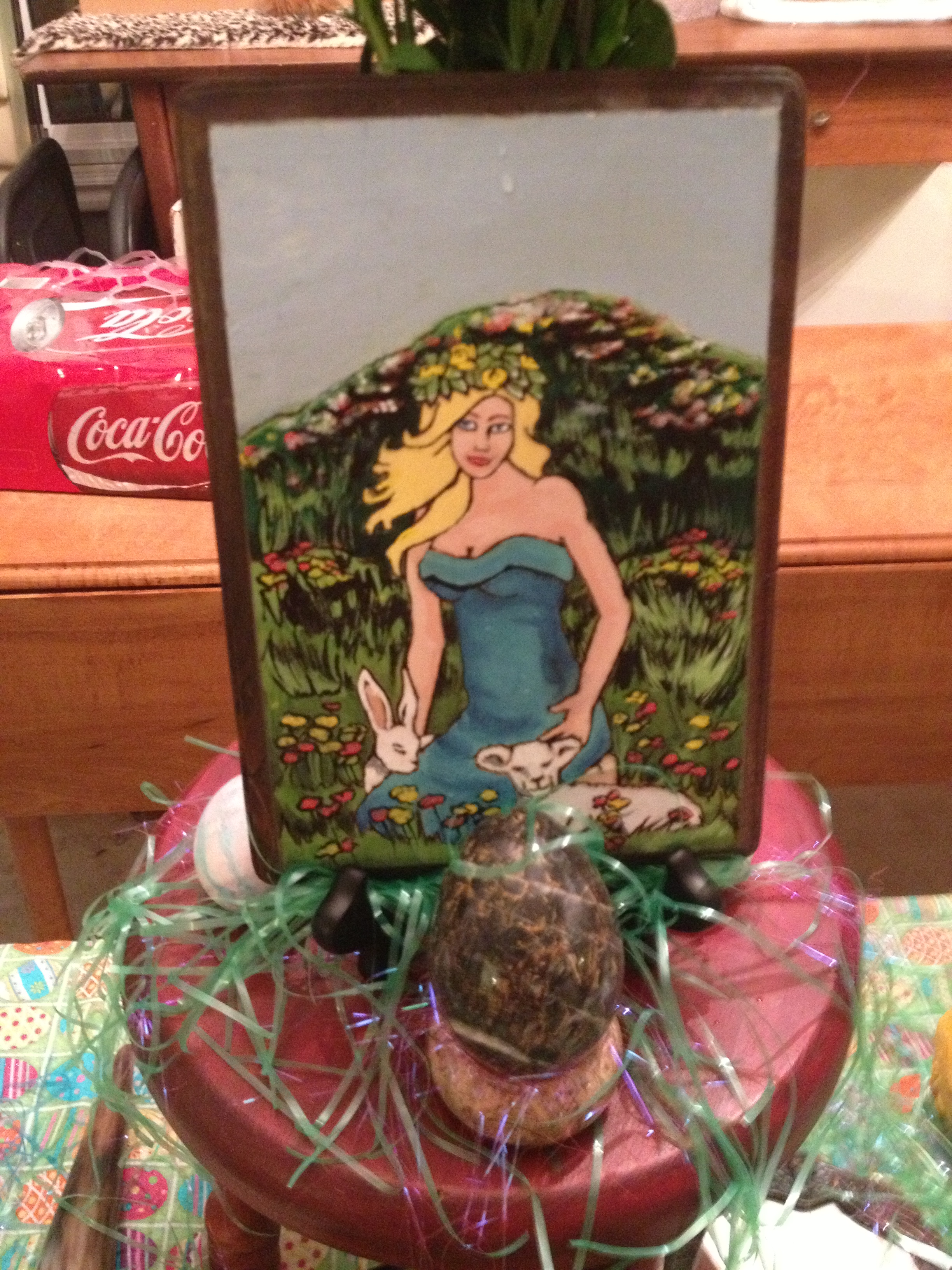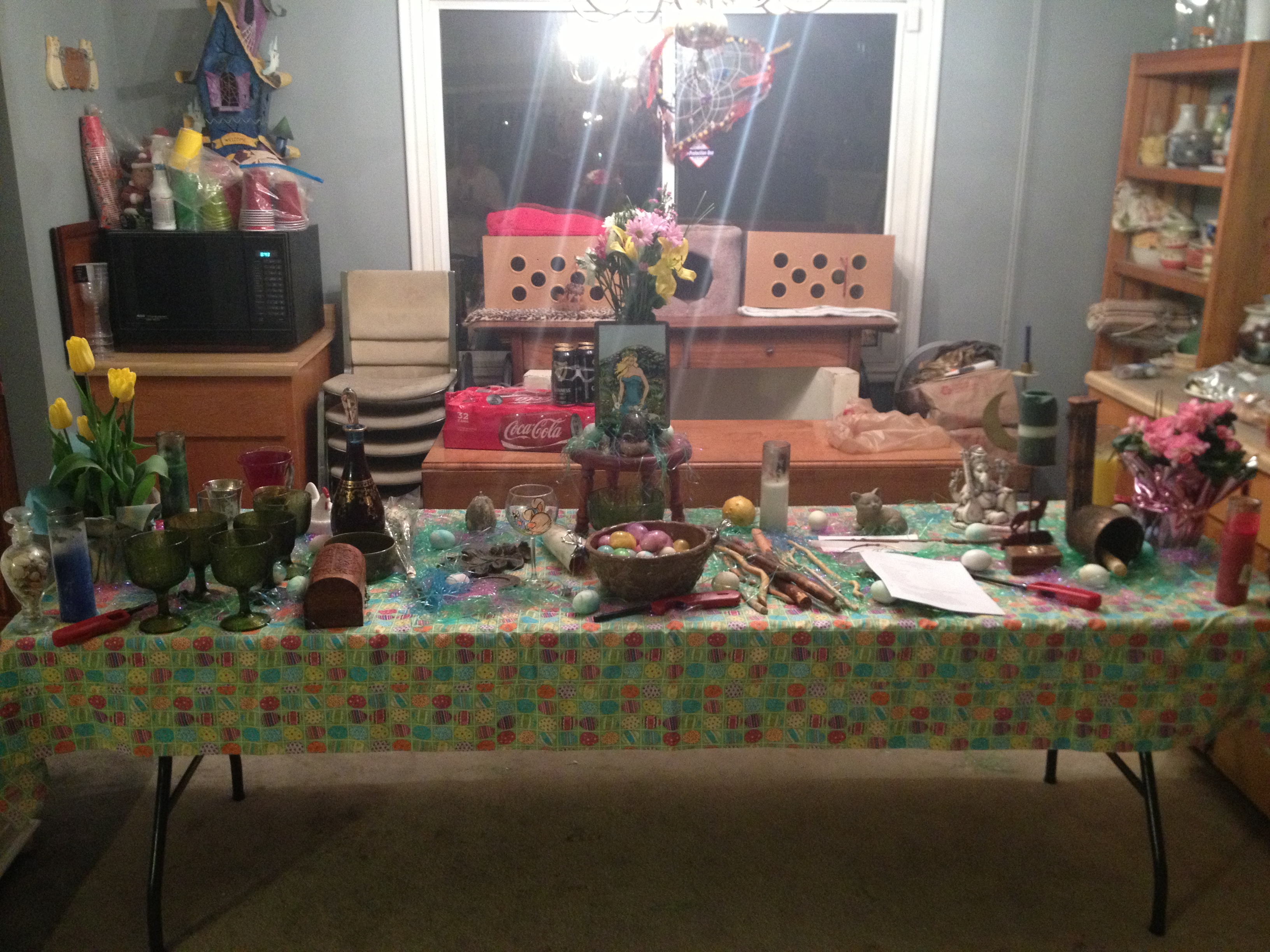 With the usual openings and calling of the quarters, the Ostara celebrations began. With the altar decorated in spring fashion with egg that had been dyed before hand by president Curetn and SLPS member Rena Fairbrother, ribbon and a special custom Ostara plaque, the entering the circle happened after the cleansing of the temple space. The ritual took place in doors this year because of the weather temperatures being in the 30s. As the people entered the space, they were cleansed and consecrated to work magic and give honoring to the Great Goddess.