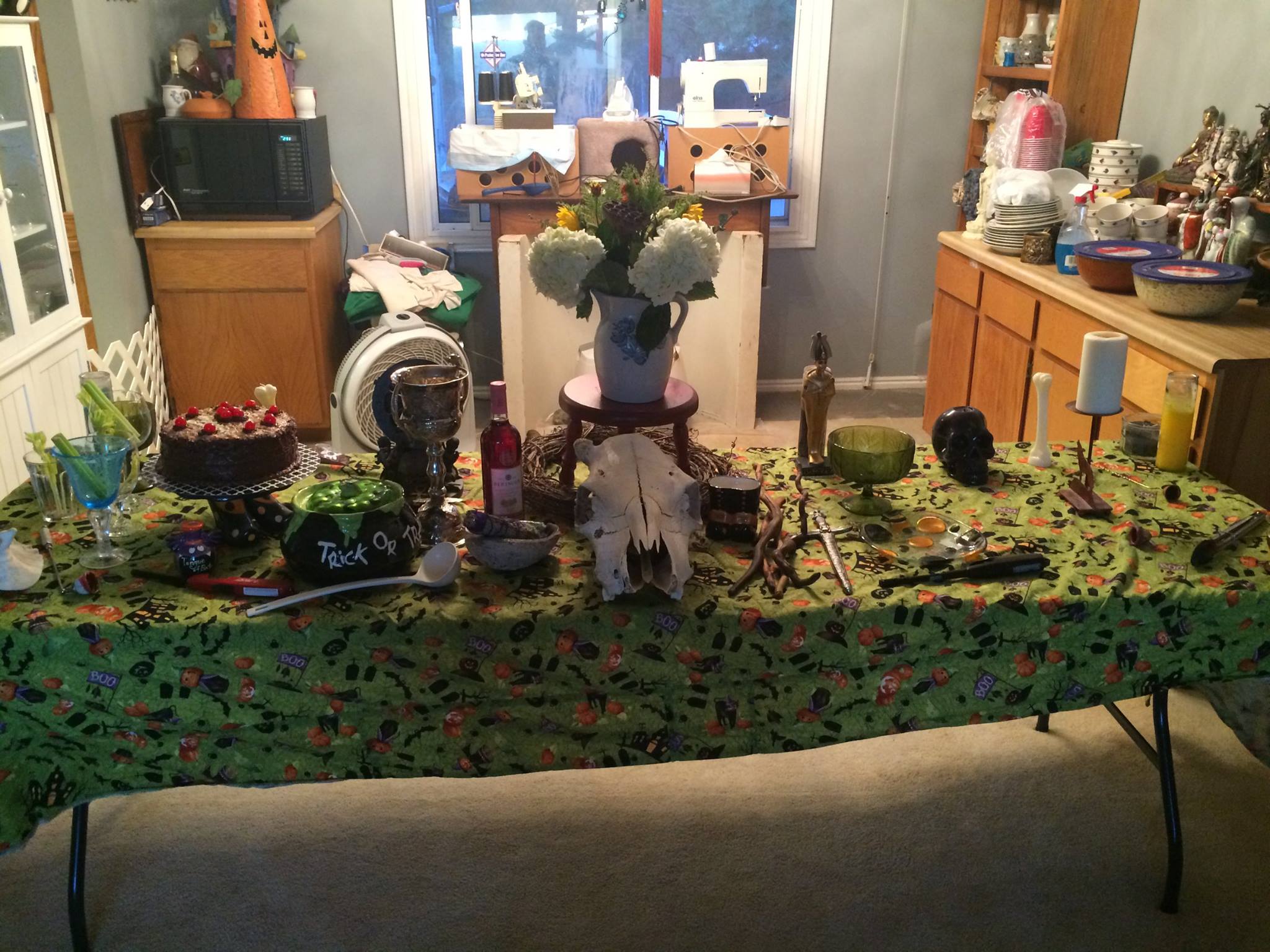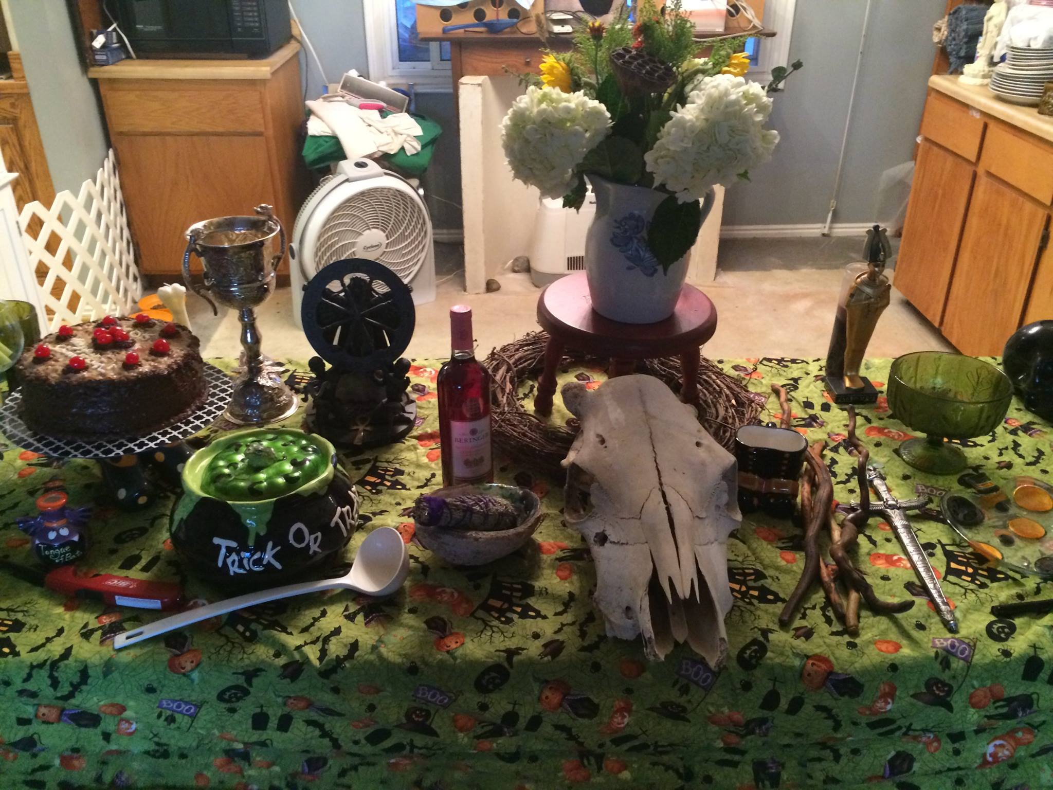 The right on October 24 went splendidly, with a homemade death by chocolate cake being the main cake, and bloody Mary’s for the wine. Osiris and Arianrhod were invoked as the patrons of the rite. The ancestors were called in with the song Samhain by Lisa Thiel on her album “Circle of the Seasons”. To calm the energies, the song Shanti (Peace Out) by MC Yogi on his album Elephant Power was played to bring everyone back and dismiss the dead. Feastings afterwards were spiced apple cider and Puerto Rican spaghetti.