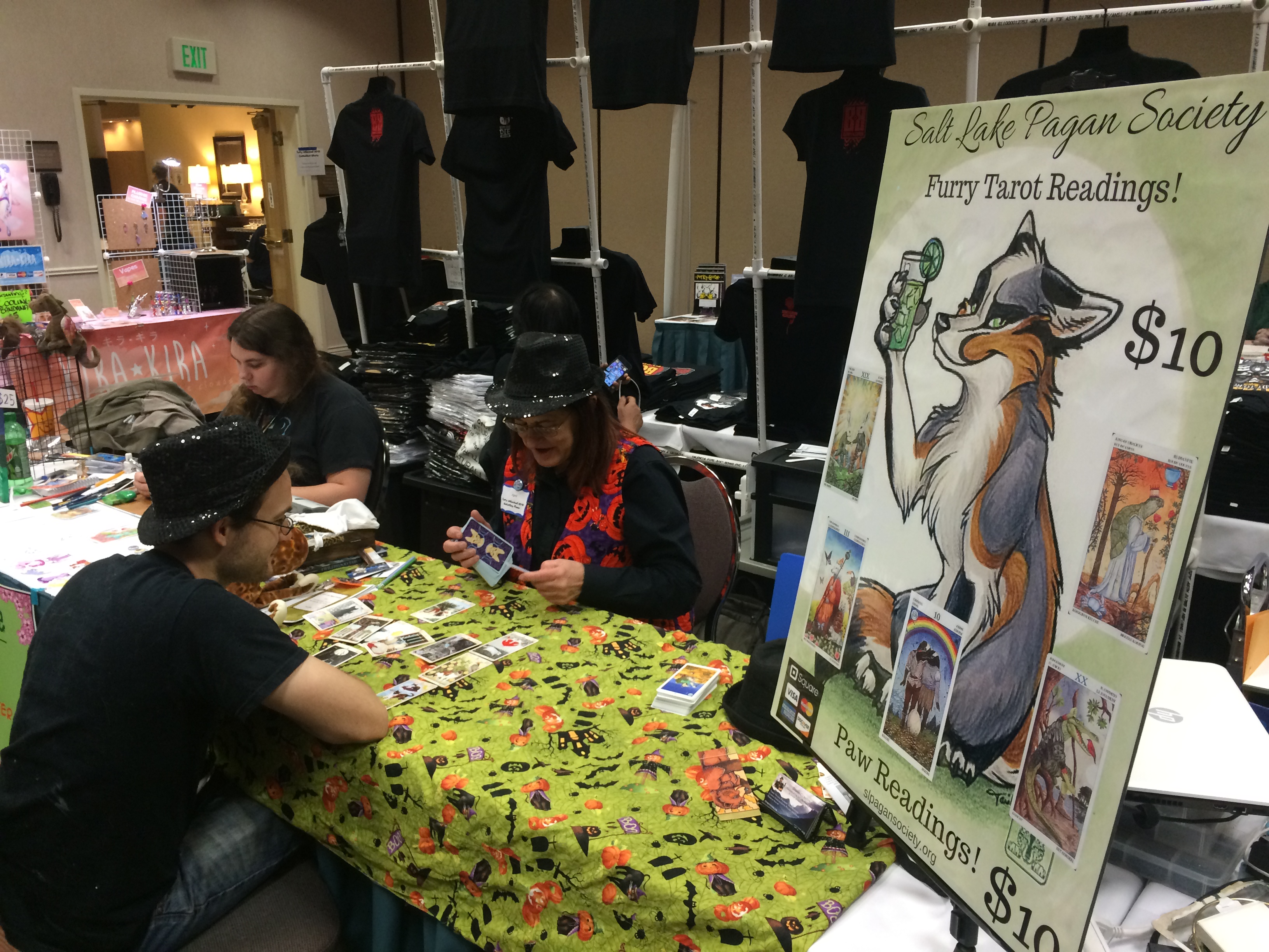 Ever heard of a furry? Seen some people in animal suits walking around? Unfamiliar with the term otherkin? You may have a had a furry encounter! SLPS vended at the 2015 Furry Unlocked convention at the Doubletree Suites Hotel in Salt Lake City, Friday October 30- Sunday November 1. It was an excellent venue in which to get familiar with the furry community of Utah and to perform outreach. Many of the furrers showed surprised, and the admin came to the table announcing how surprised they were that SLPS had event contacted them, much less wanted to vend at their convention and do a panel! SLPS told them they we are a supportive and inclusive group, that even in the furry community we can find a way to outreach. SLPS did $10 furry tarot and paw readings, using the Tarot of the Animal Lords deck by Lo Scarabeo and Angelo Giannini which uses anthorpomorphized animal in costumes.