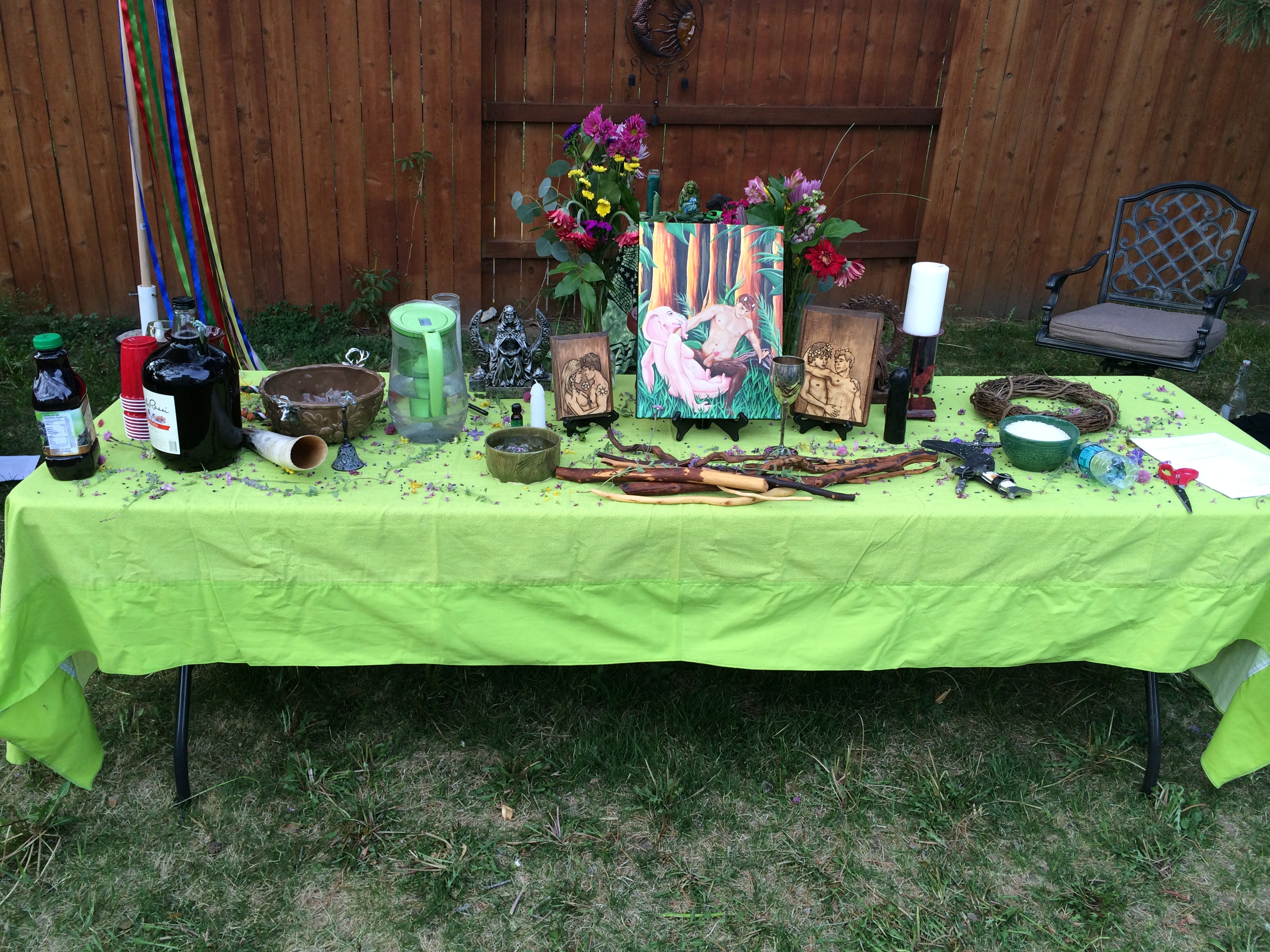 The members of SLPS met on Sunday, May 1, 2016 at 3pm to celebrate the union of the Lord and Lady in matrimony and at the Beltane wedding. The Maypole was unwoven from 2014 and set up on the lawn. Flowers from the garden adorned the altar as well as the great rite statue and queer gods painting.