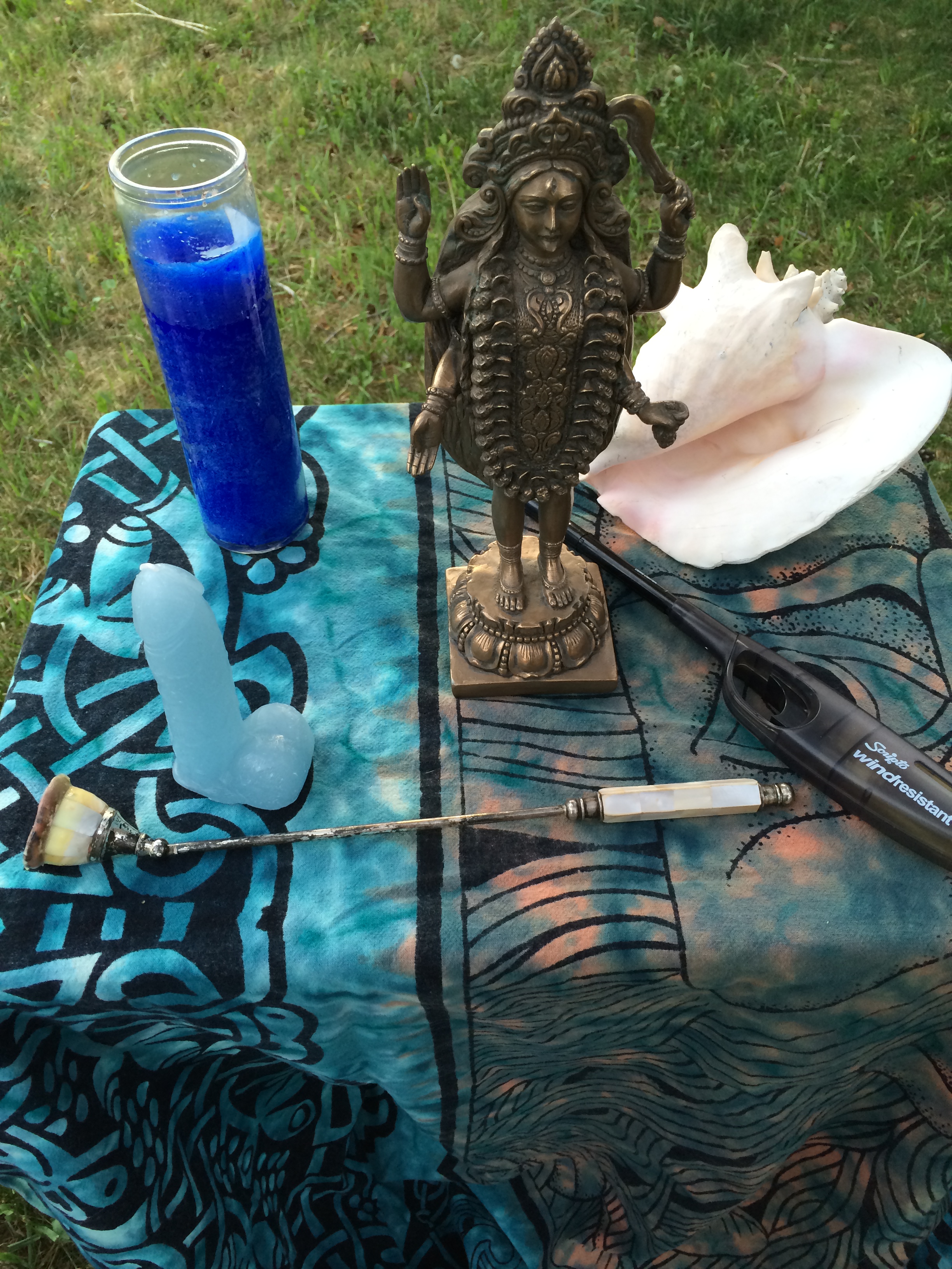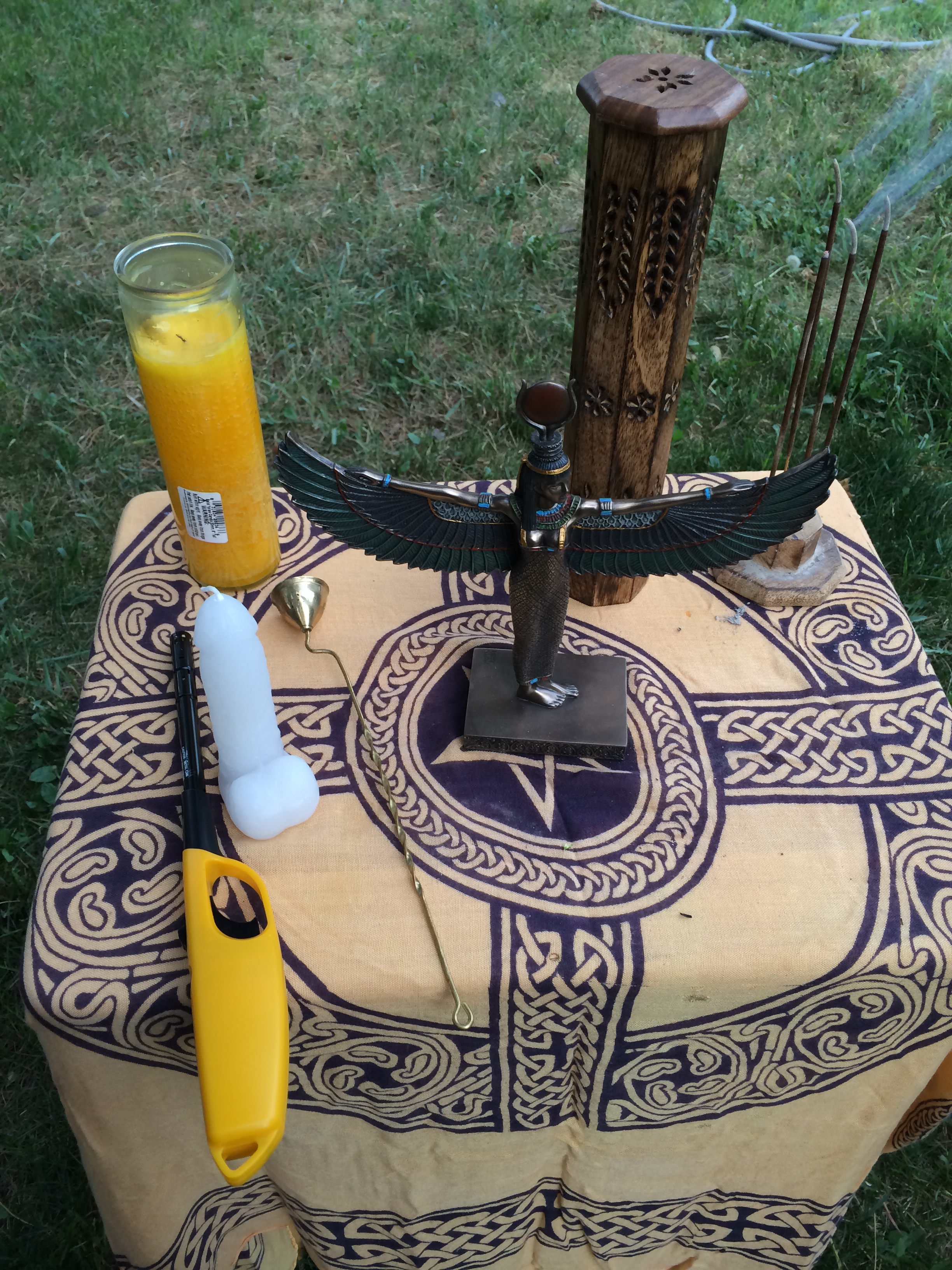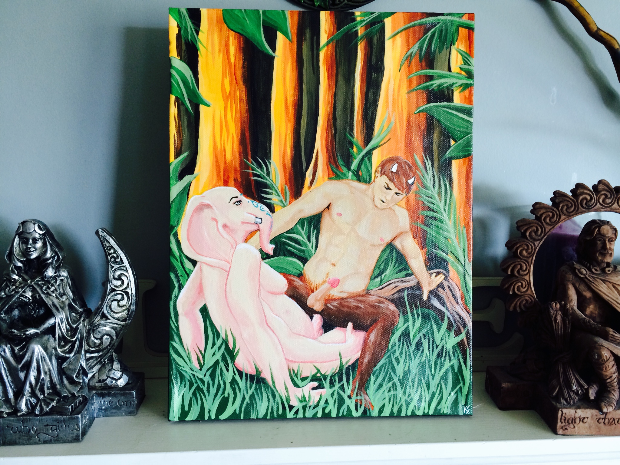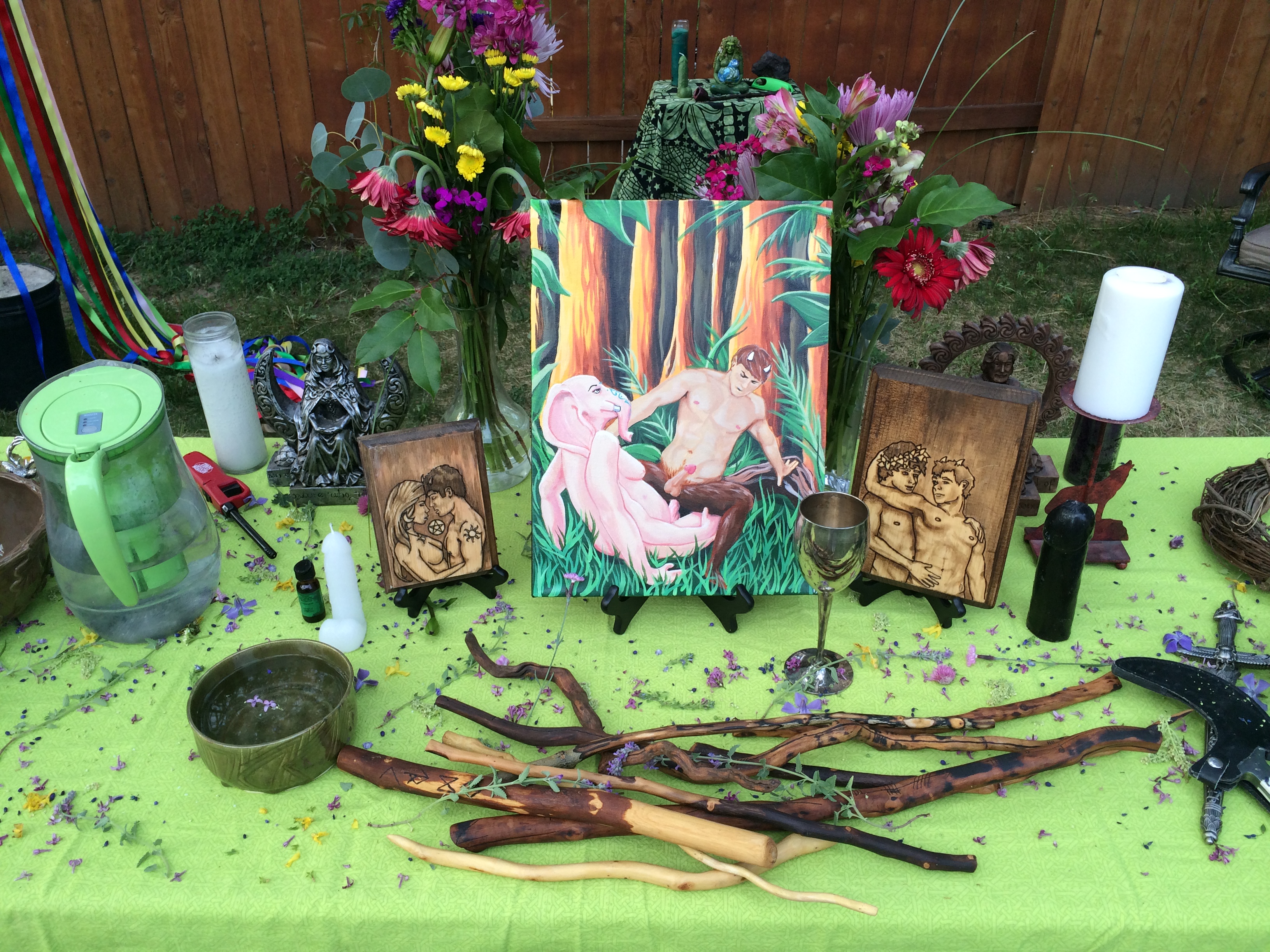 The ritual opened with the usual banishings and circle protections and elemental callings. The altar was decorated in Beltane colors and Celtic Knotwork, symbolizing the eternal nature of the Gods and everyonekinds connection to them. A special commissioned painting by Kurth Shoopman of Kentucky of Ganesh and Pan in the great rite was the centerpiece, symbolizing the Queer nature of divinity and everyonekind.