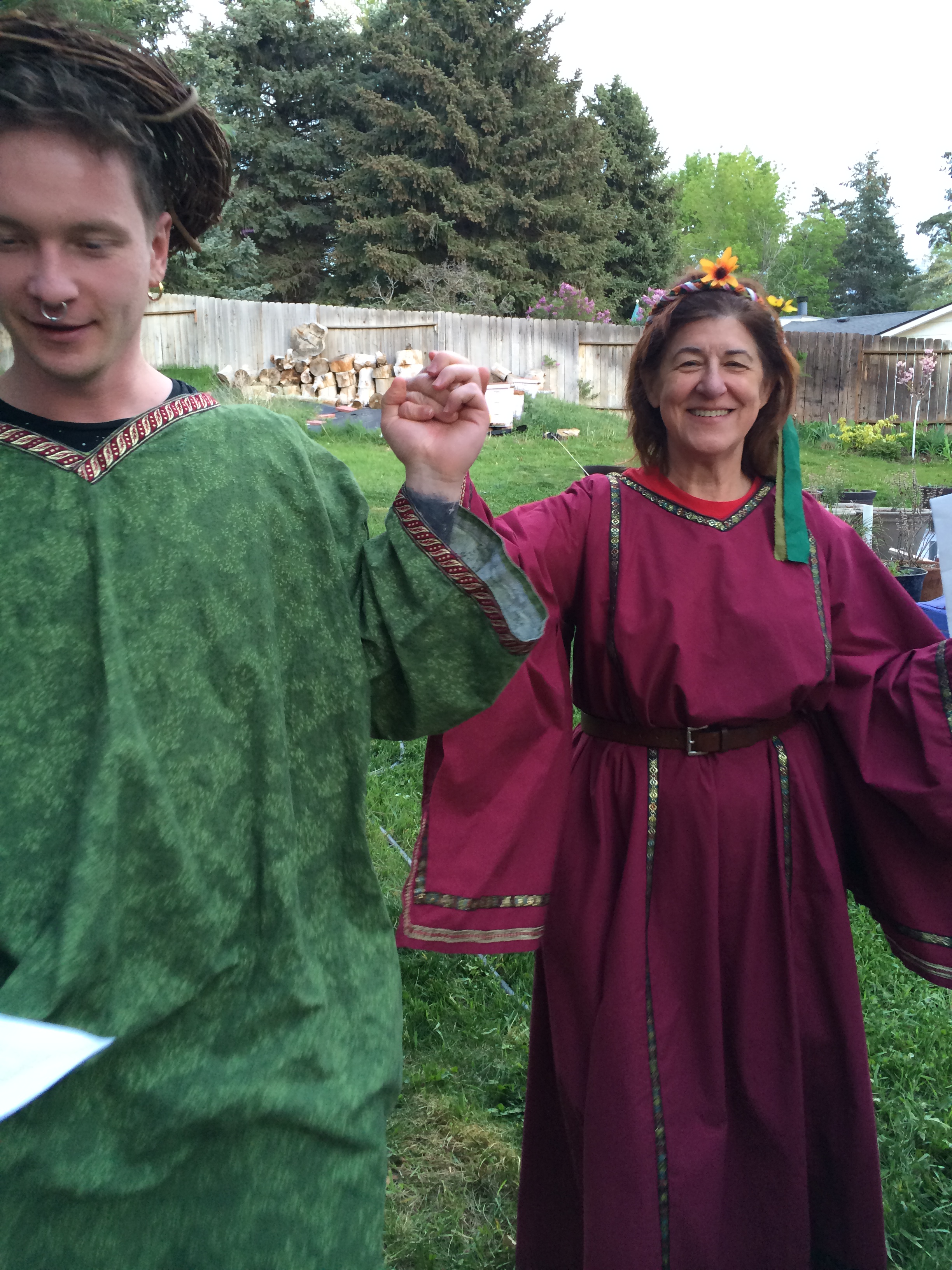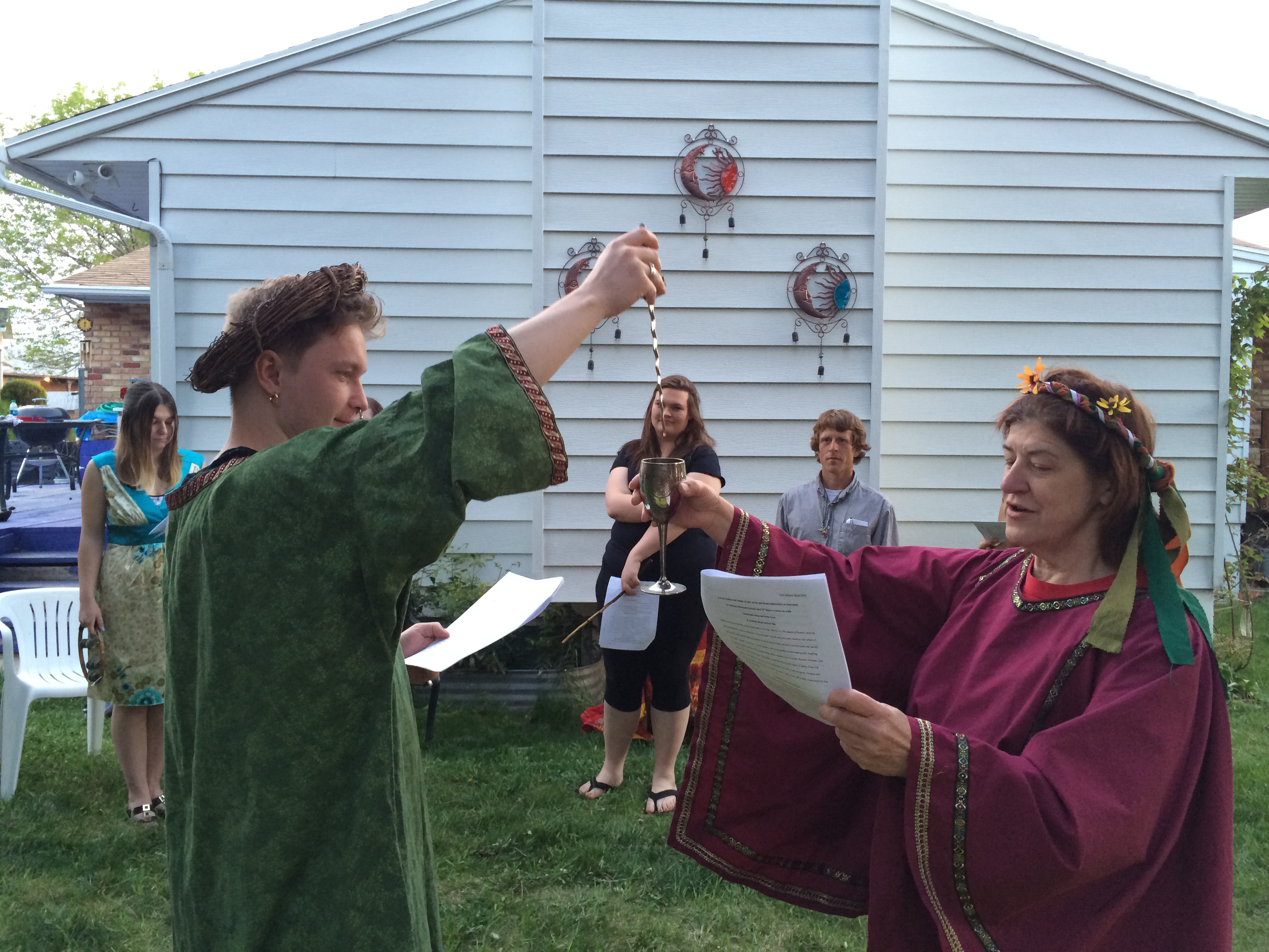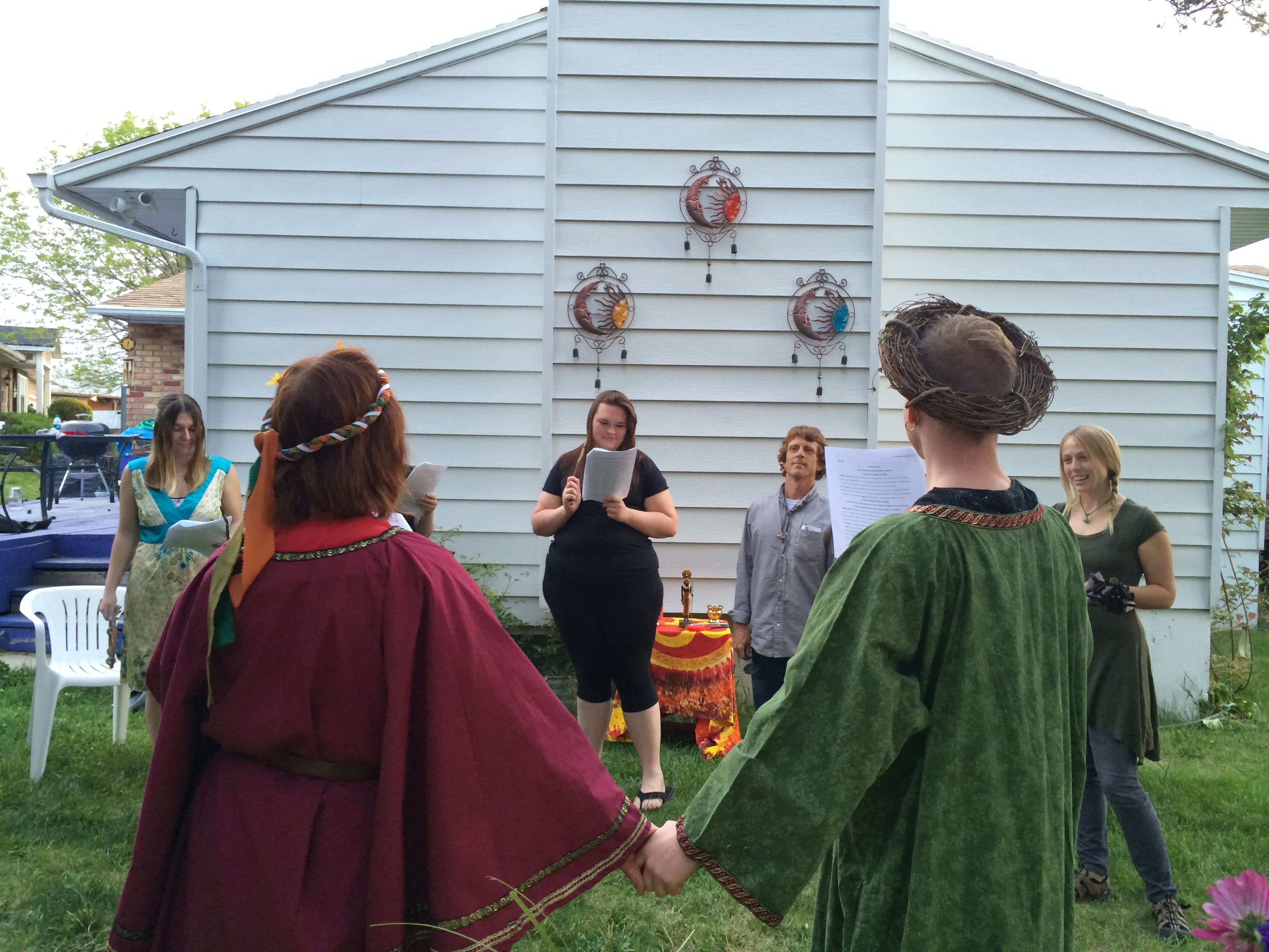 The Goddess and God united in love and became one for the day! The Great Day of Beltane, when the God and Goddess come together for their wedding ceremony and to make new life that will be born at Yule. The ceremony was held outside on a beautiful Sunday afternoon, May 3, 2015 at 3pm. The altar was decorated with Celtic knot work items and plaques of the Goddess and God and of the God and God for Queer mysteries. A lesson on the meaning and origin of Beltane took place, and the offerings were white wine and strawberry short cake. The feastings later in the evening were Italian sausage spaghetti, green salad, and garlic bread with red wine.